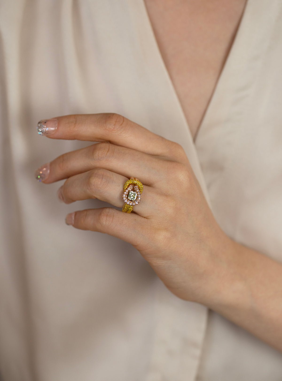 For Red-carpet events, milestone celebrations & private collections and high-visibility Engagement, wedding & high-jewelry proposal, allow the ring to become the visual anchor. Align metals to 14K Rose Gold, resist stacking too many additional pieces on the same hand, and let the way the diamonds sit and move do the work. It is a styling approach that reads as confident, modern and unmistakably high jewelry.