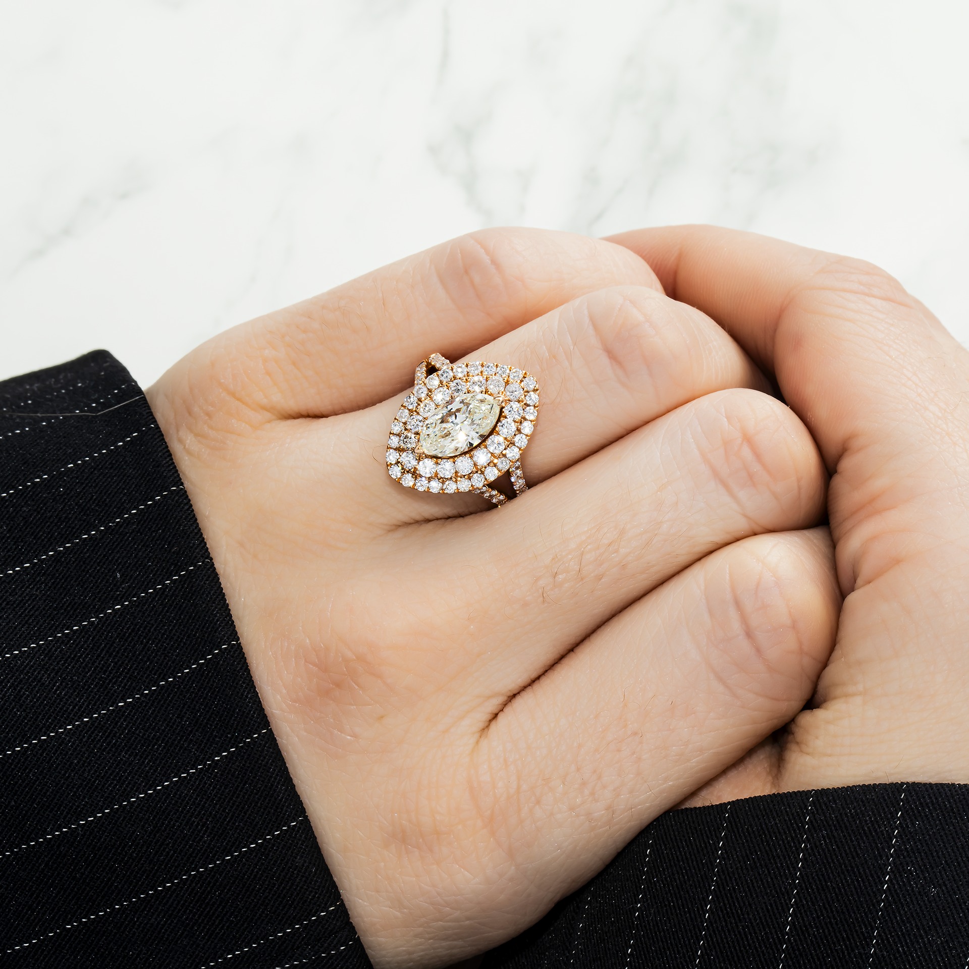 Approximately 1.52 carats, marquise, diamond ring. Designed to feel like a personal signature: refined, wearable, and unmistakably high-end. Colour family: Brilliant White. Metal: 14K Rose Gold. The setting prioritises stability and comfort, so the diamonds sit securely while keeping light open across the surface. The craftsmanship is engineered so the sparkle reads as one surface of lightβnot scattered points competing for attention. An enduring asset in jewel form: beautiful to wear, credible to document. Classic Charmβa piece defined by brilliance, poise, and longevity.