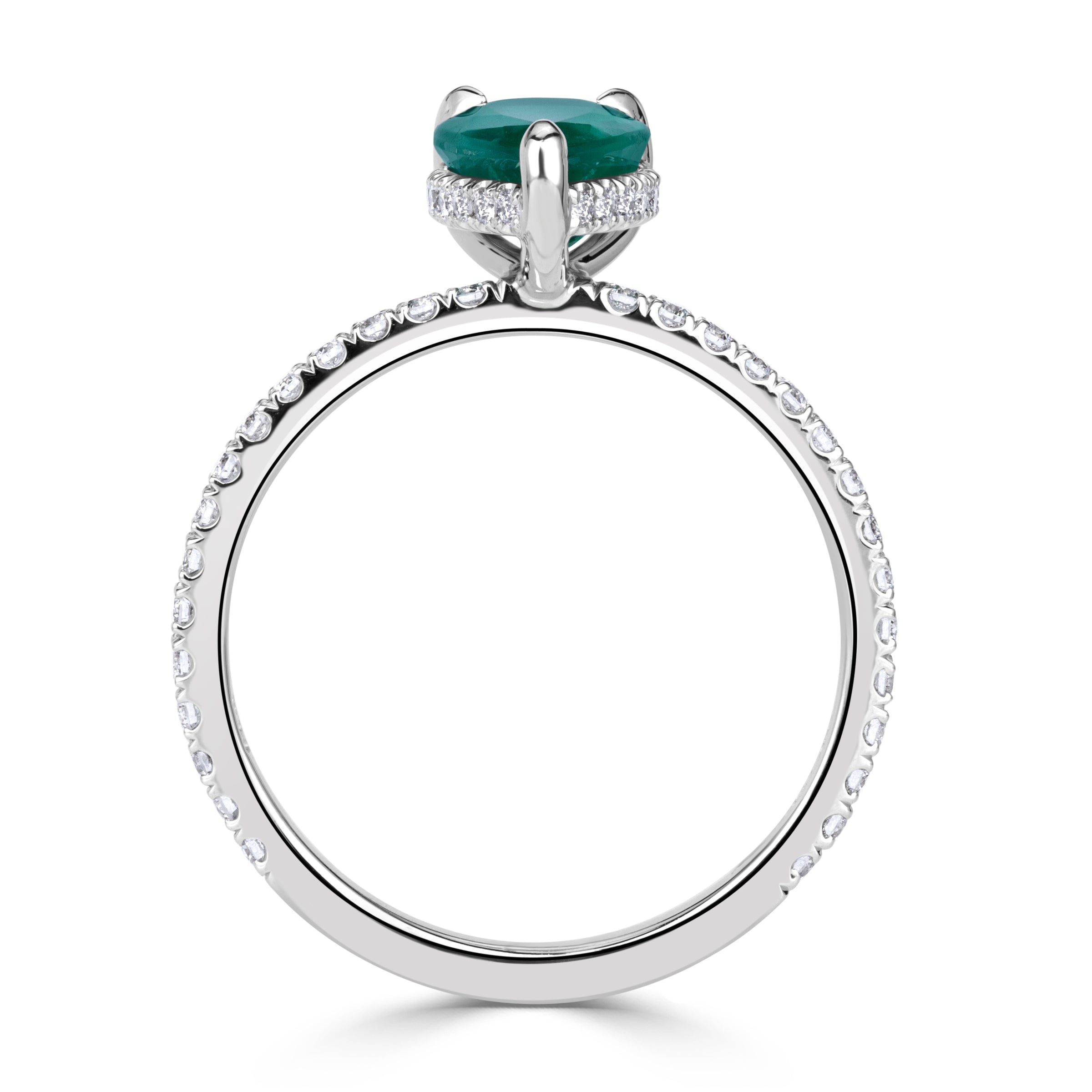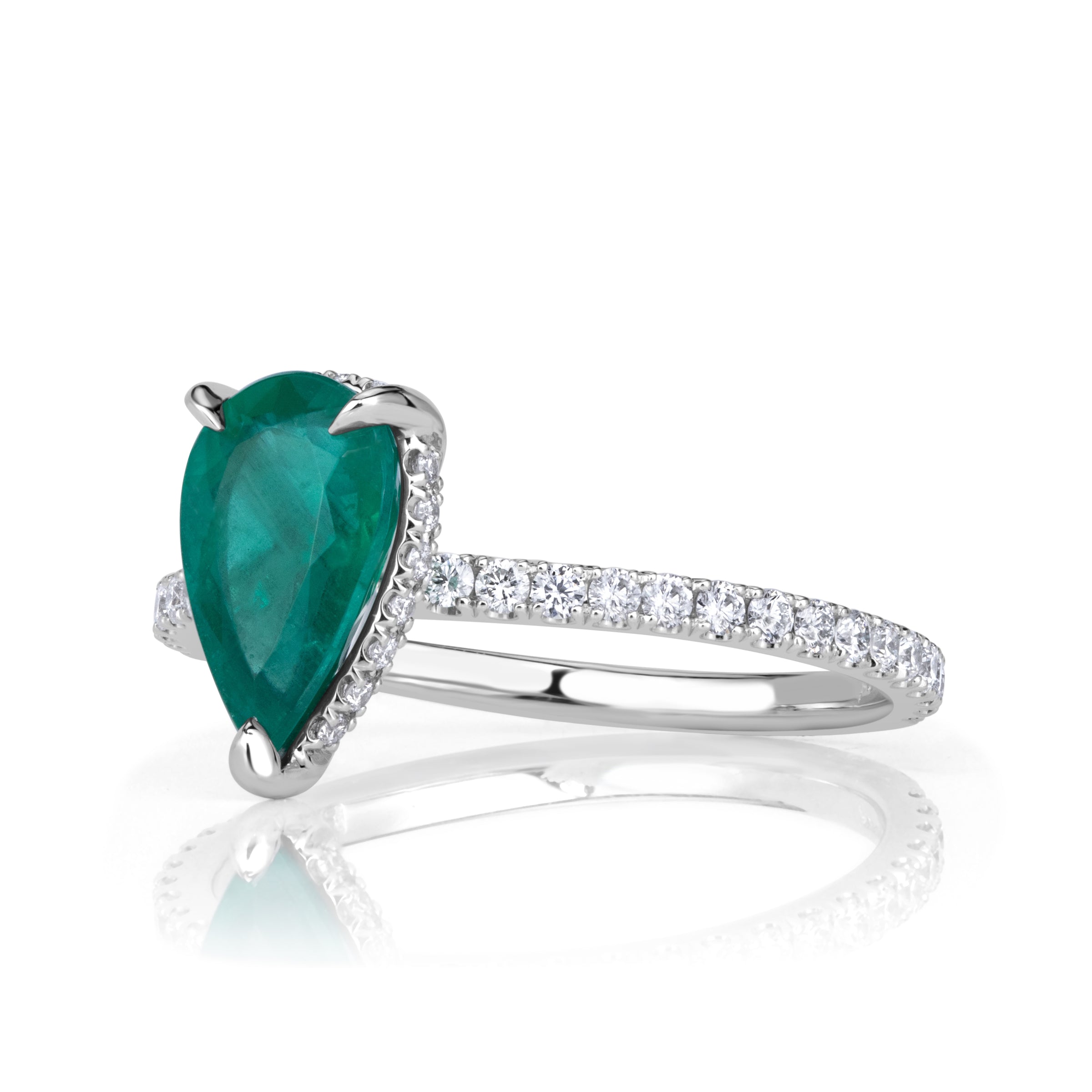 Viewed from any angle, the approximately 1.56 carats of Emerald Green pear shape diamonds create a wide field of brilliance across the finger. The carat weight is generous enough to be unmistakable in a room, yet balanced so that the ring never feels overpowering.