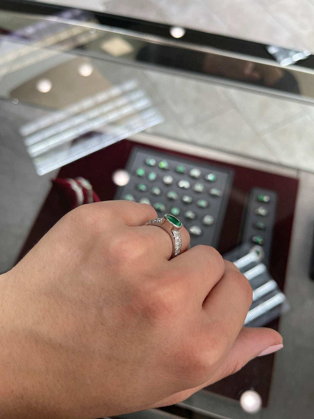 Everyday brilliance is easiest to maintain when the ring is kept free from invisible films of cream, sunscreen and fragrance. Wipe the Emerald Green gemstones gently with a lint-free cloth at the end of the day, then rest the ring in its own pouch or box rather than loose in a jewellery tray.