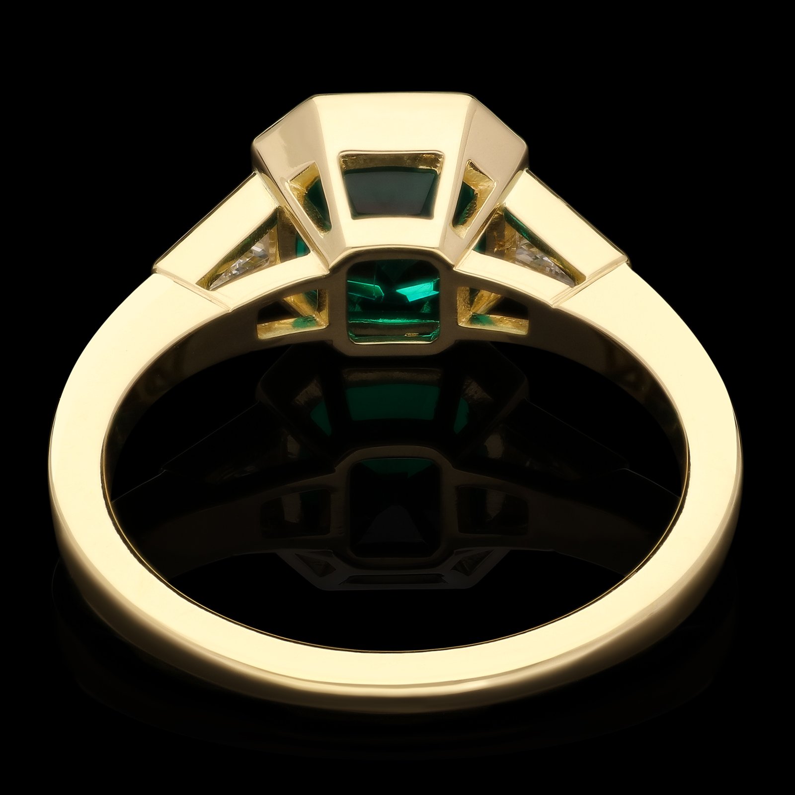 Approximately 1.83 carats, emerald, statement ring, diamond ring. A collector-facing piece where proportion and light return are treated as non-negotiable. Colour family: Emerald Green. It wears with authority without shouting—substantial enough to anchor a look, restrained enough to stay timeless. The craftsmanship is engineered so the sparkle reads as one surface of light—not scattered points competing for attention. For clients who invest in fewer, better jewels—and want that decision to show. Refined Light—a piece defined by brilliance, poise, and longevity.