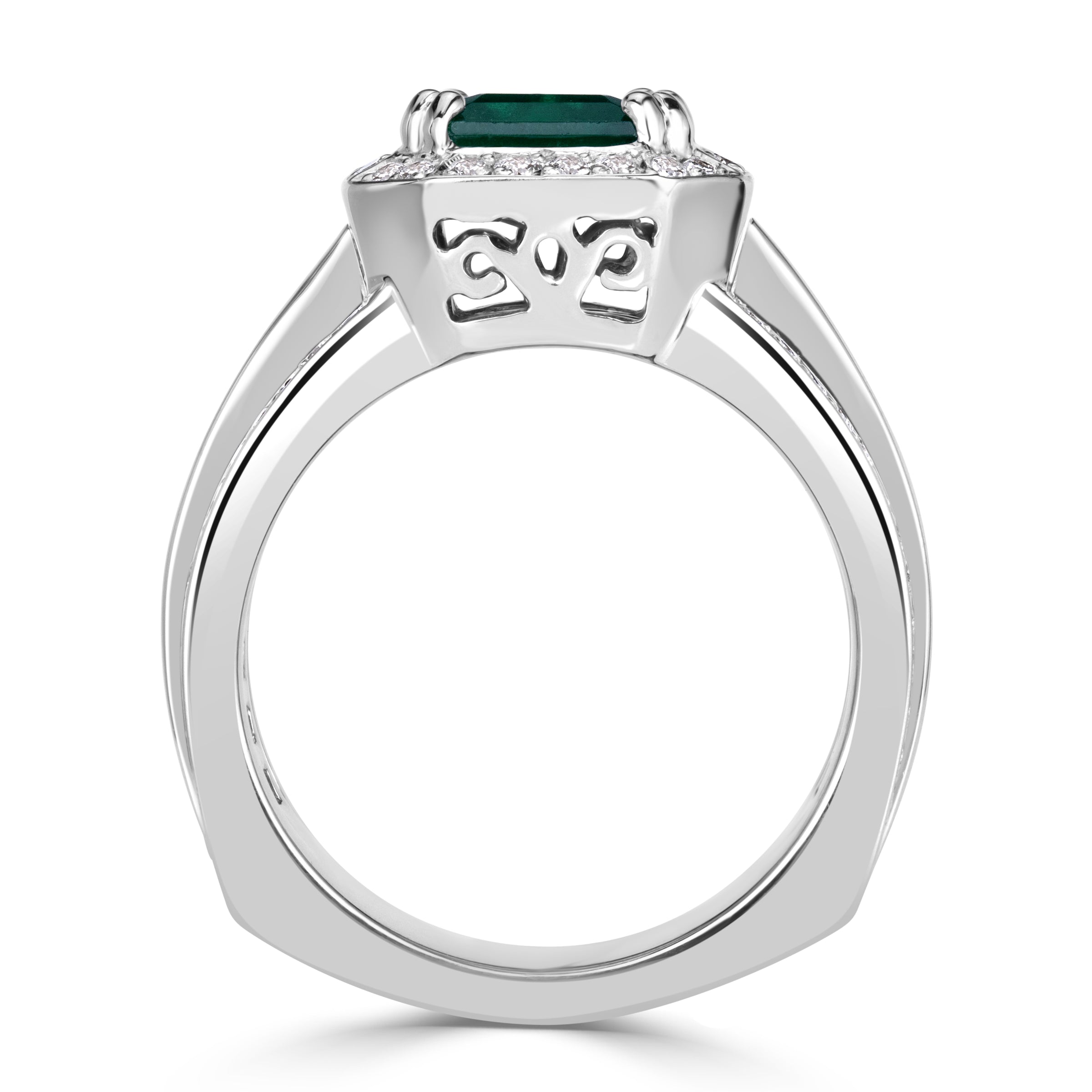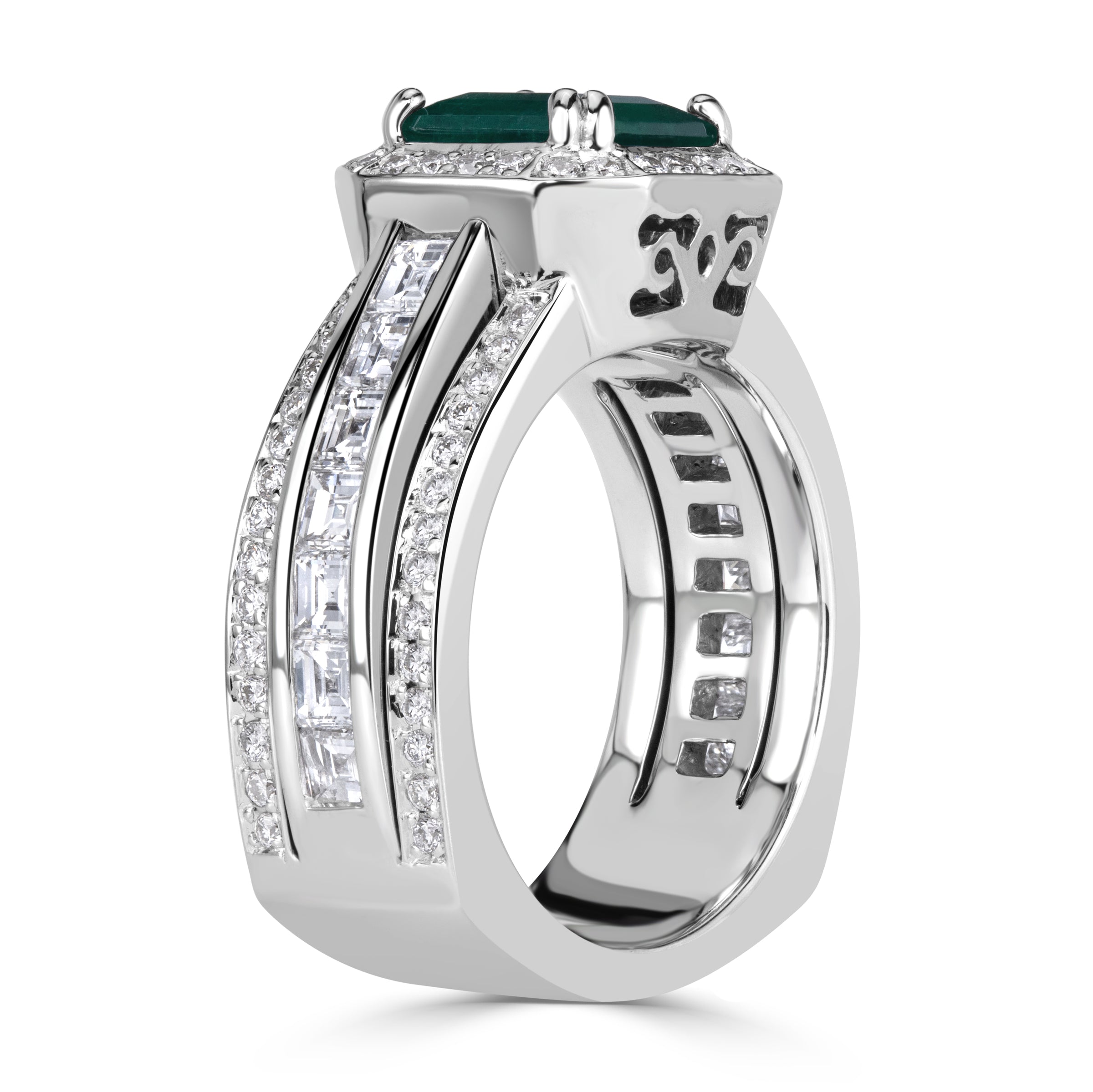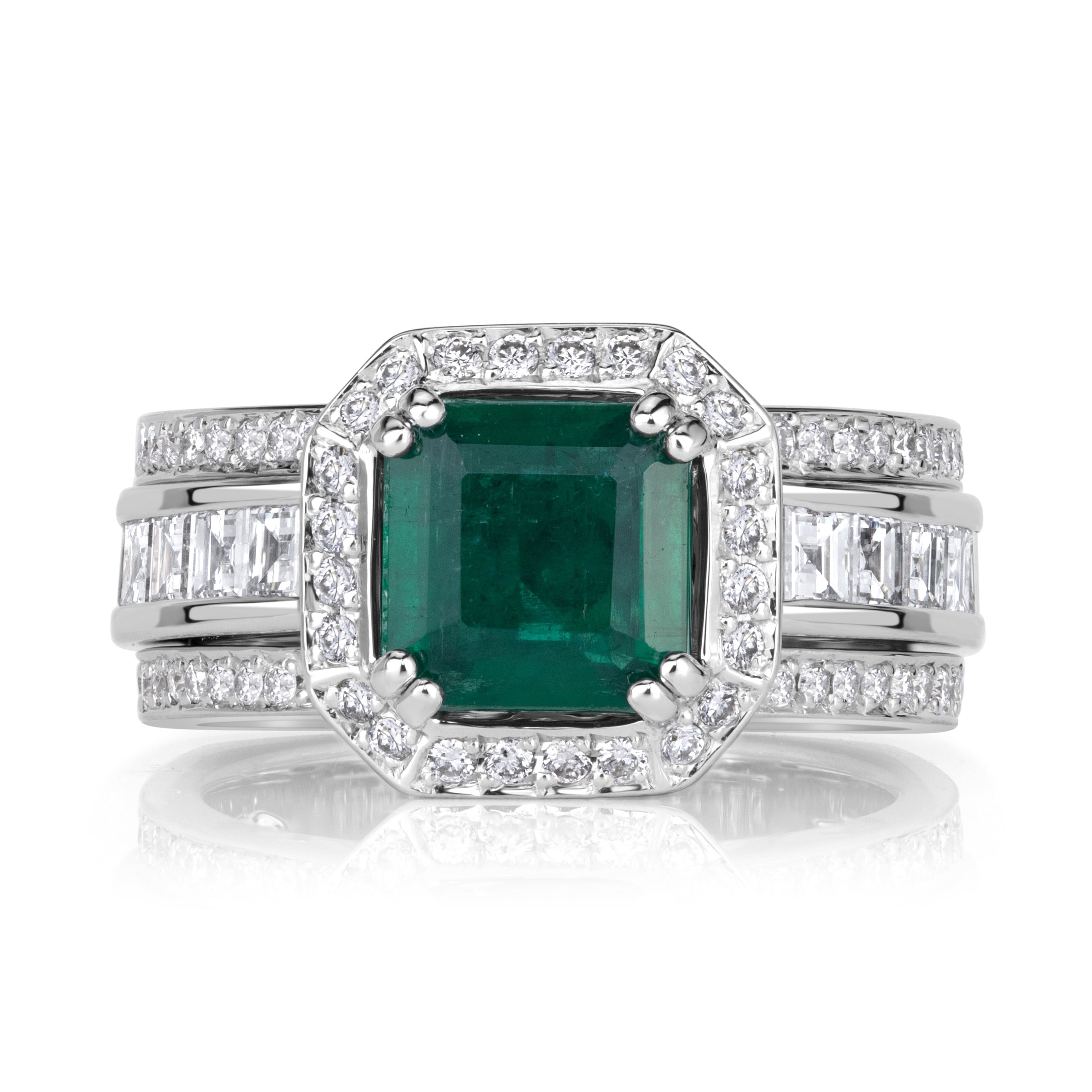 The presence of Emerald cut diamonds in this Emerald Green palette gives the ring a calm, confident radiance that transcends trend and season.