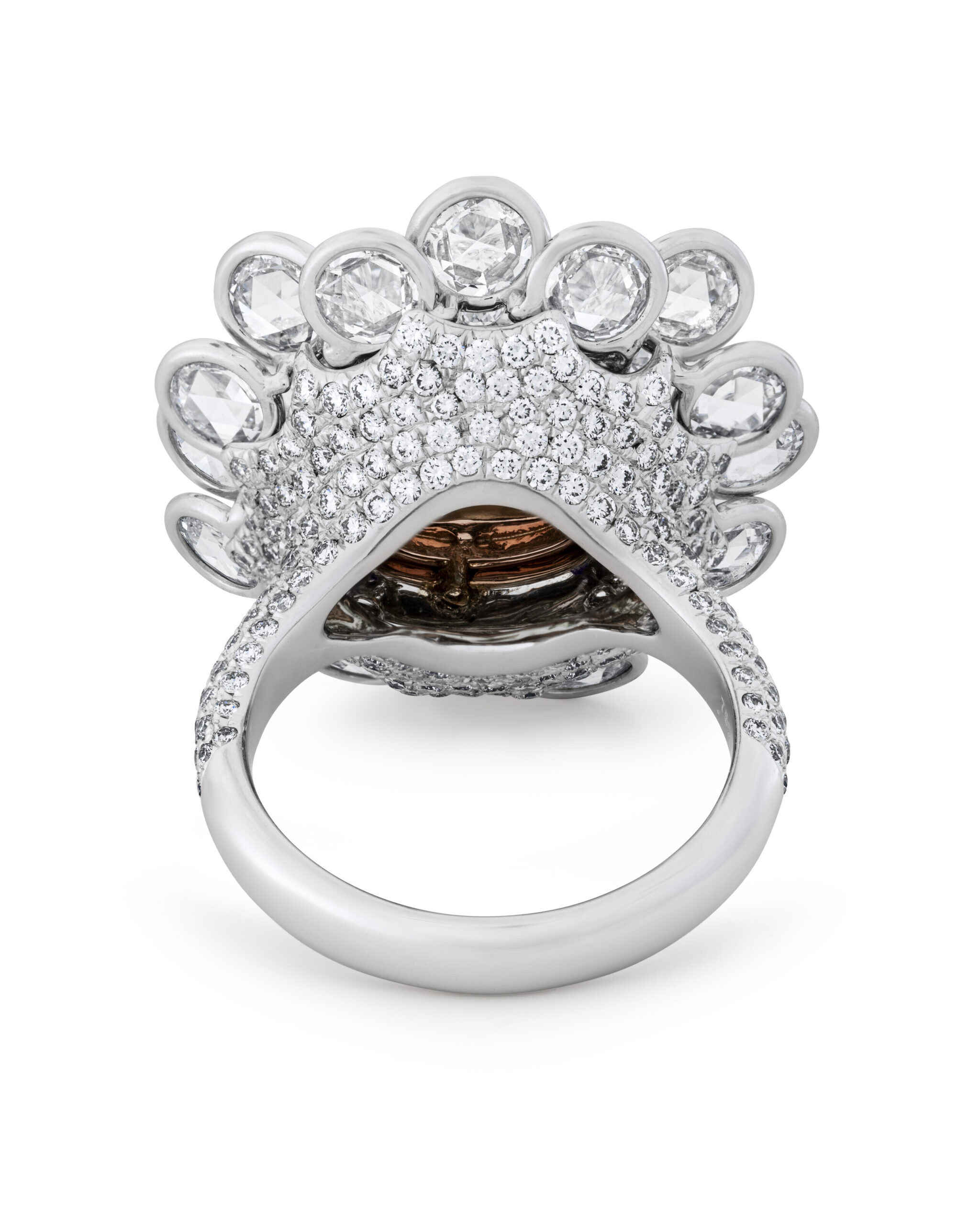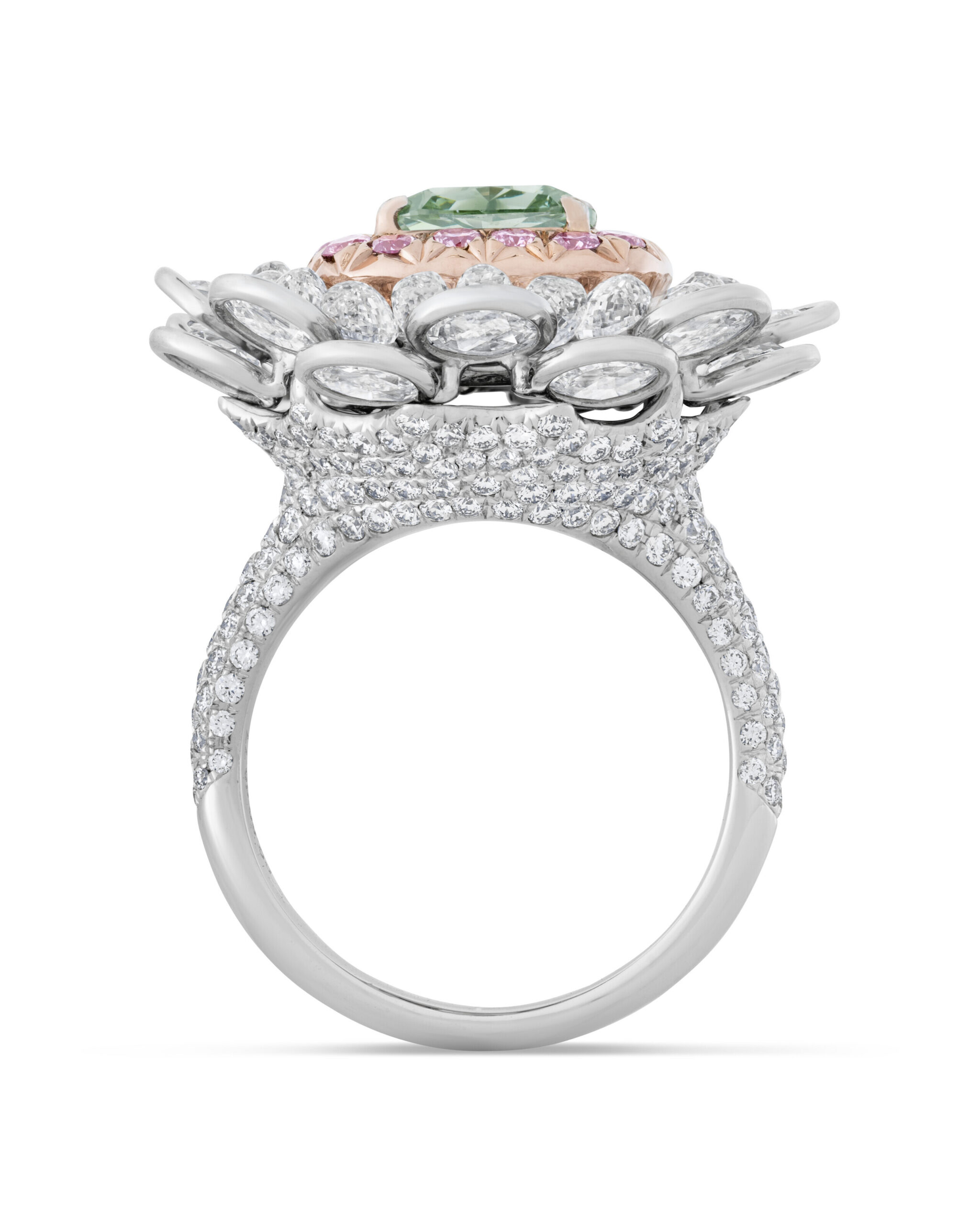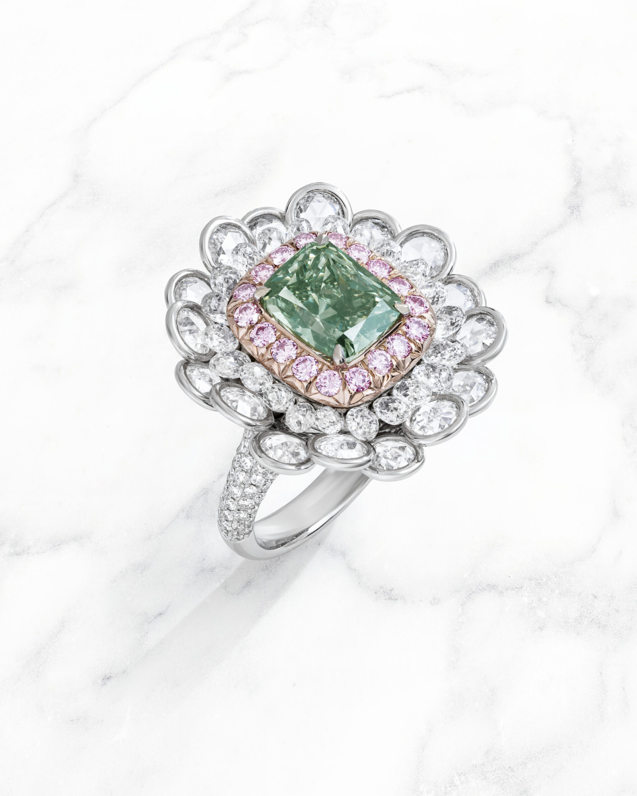 The architecture of this High Jewelry Statement Ring is engineered for real life, but even the finest fancy colour diamonds benefit from thoughtful handling. Avoid exposing the ring to extreme temperature changes, abrasive surfaces or chlorinated pools, which can dull the surface optics over time.