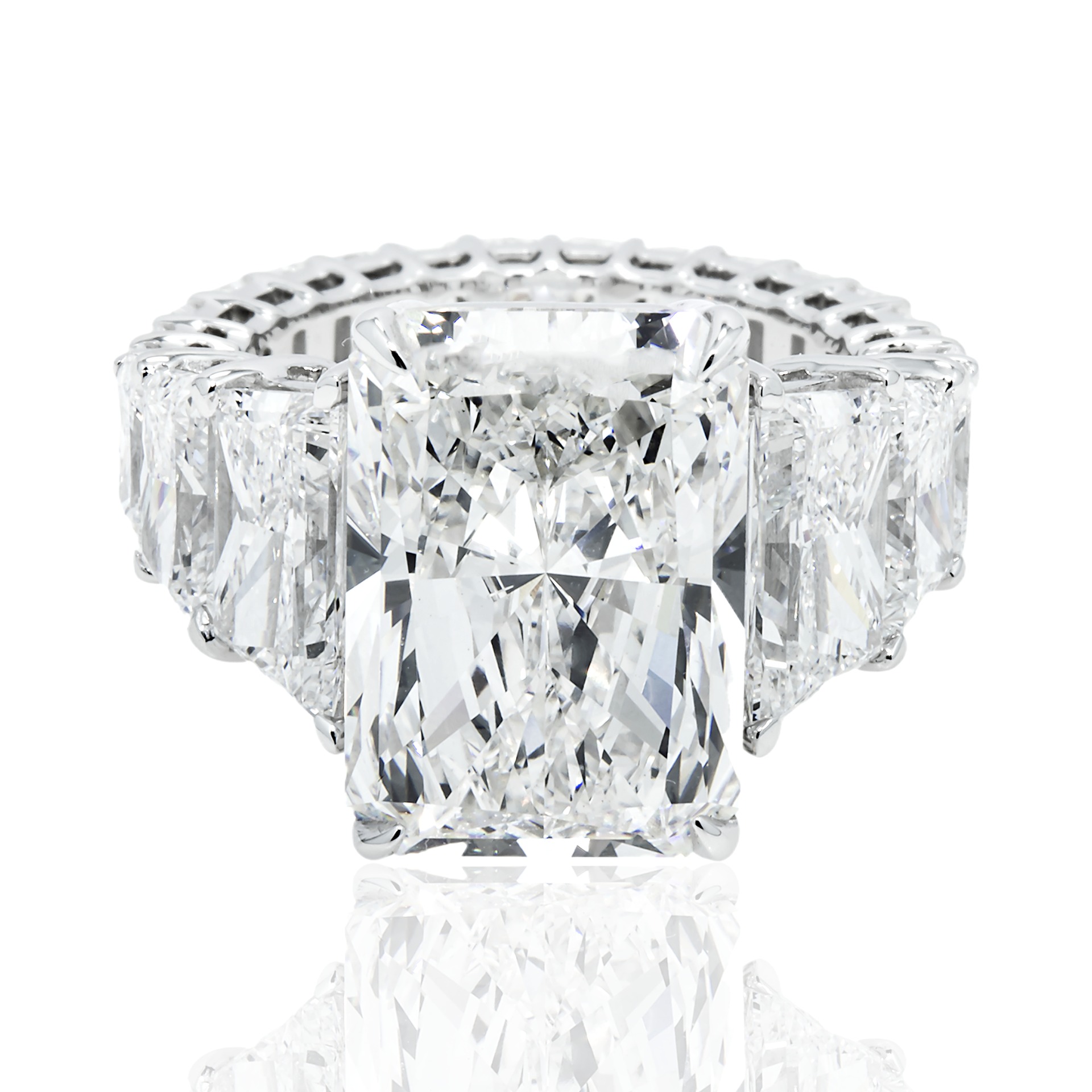 Viewed from the side as well as from above, the architecture reveals how carefully the diamonds are staged. The approximately 10.03 carats of Brilliant White Radiant cut diamonds are set at slightly graduated heights and tilts so they catch and return light to the viewer from multiple directions.
