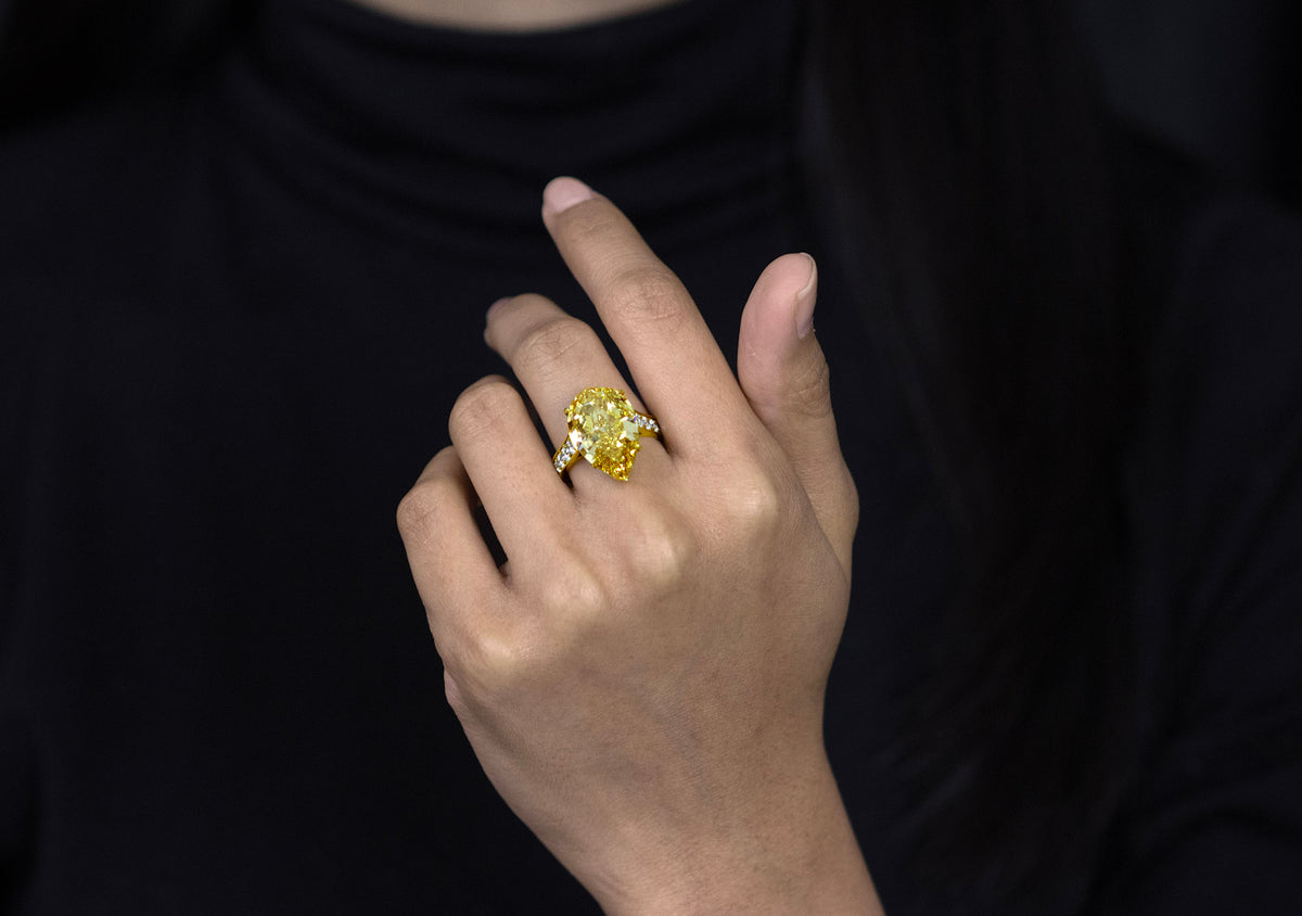The interplay of 10.06 carats and Fancy Yellow produces a ring that reads as a serious carat investment on the hand. At the same time, the controlled height and footprint ensure it sits securely and comfortably through a full day or evening.