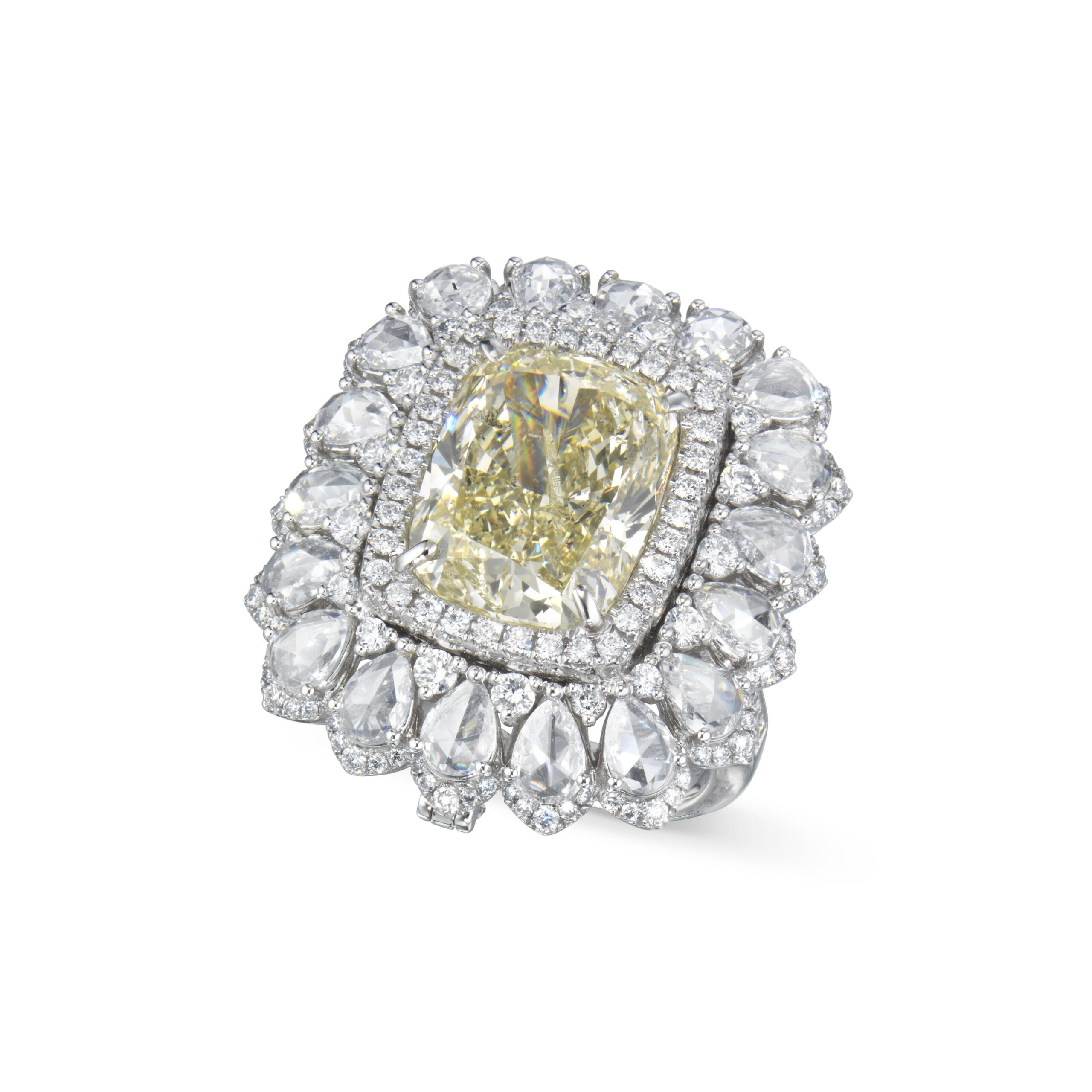 Approximately 10.15 carats, cushion, statement ring, diamond ring. A collector-facing piece where proportion and light return are treated as non-negotiable. Colour family: Fancy Yellow. Metal: 14K White Gold. It wears with authority without shoutingβsubstantial enough to anchor a look, restrained enough to stay timeless. It feels substantial on the hand, yet remains practical enough to be worn often rather than stored away. Ideal for boardroom-to-black-tie wear, with a look that stays precise under close scrutiny. A Crown-Worthy Fancy Rarityβa piece defined by brilliance, poise, and longevity.