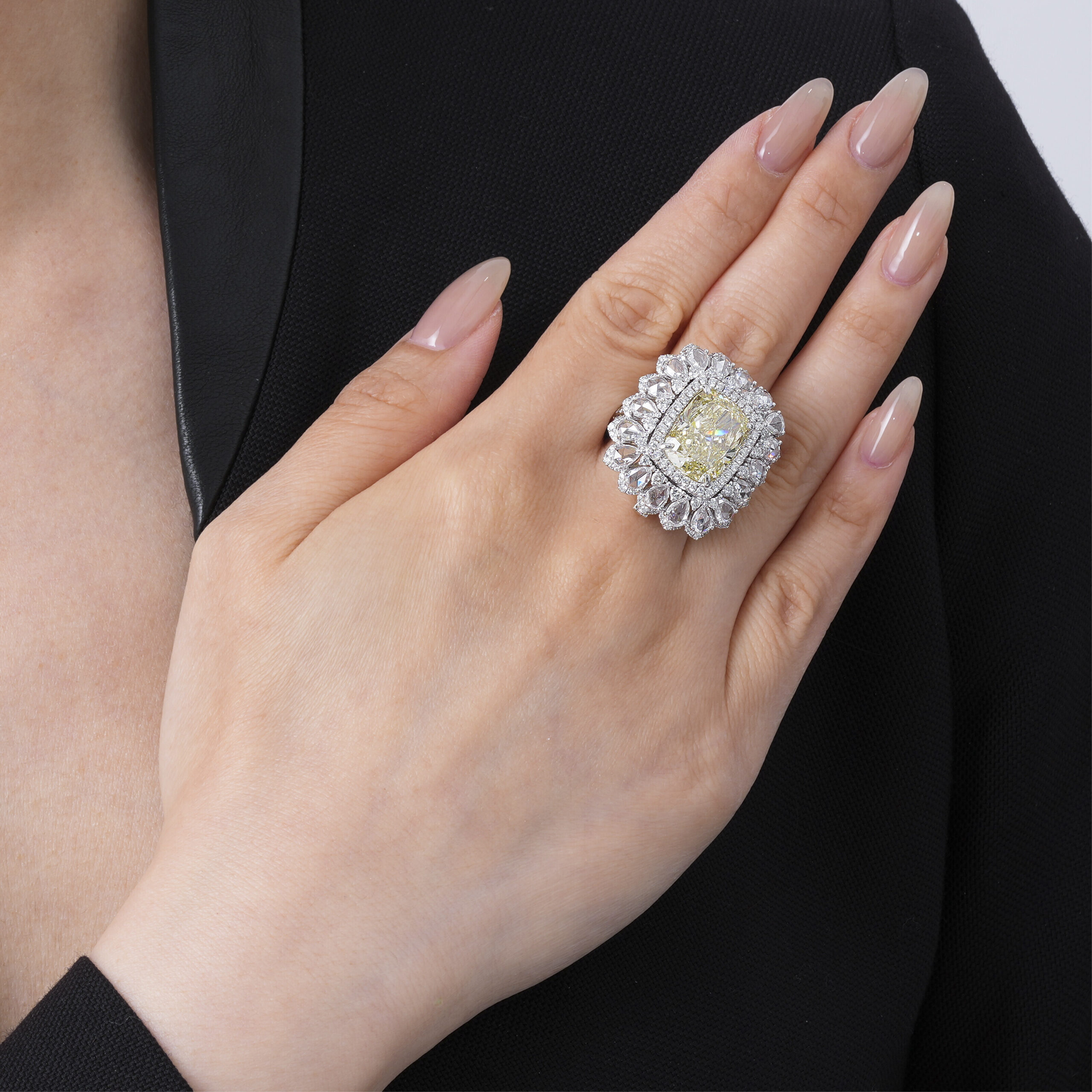 Seats for the fancy colour diamonds are cut, refined and tested under magnification, while the shoulders and shank are tapered so the weight of approximately 10.15 carats of Fancy Yellow brilliance is distributed comfortably across the finger. This invisible engineering is what allows the ring to feel surprisingly easy to wear, even though it lives firmly in the world of serious high jewelry.