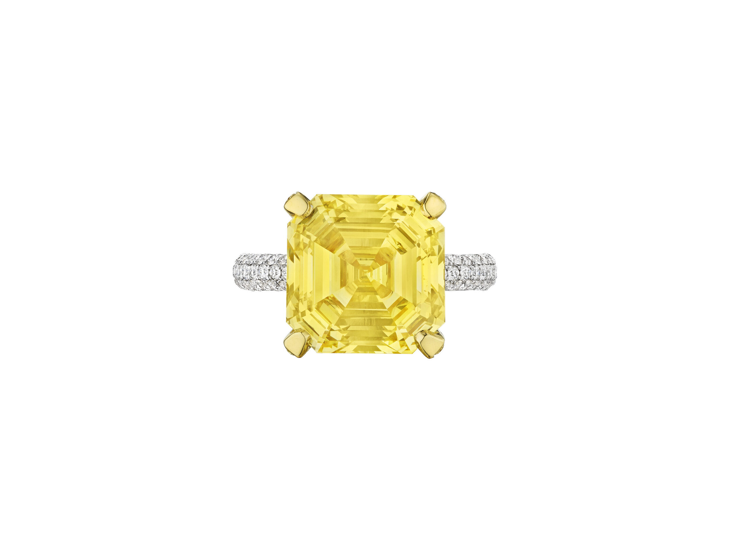 Celebrating the powerful allure of Fancy Yellow diamonds, this Legacy ring showcases approximately 10 carats of Assher diamonds in a luminous high jewelry silhouette.