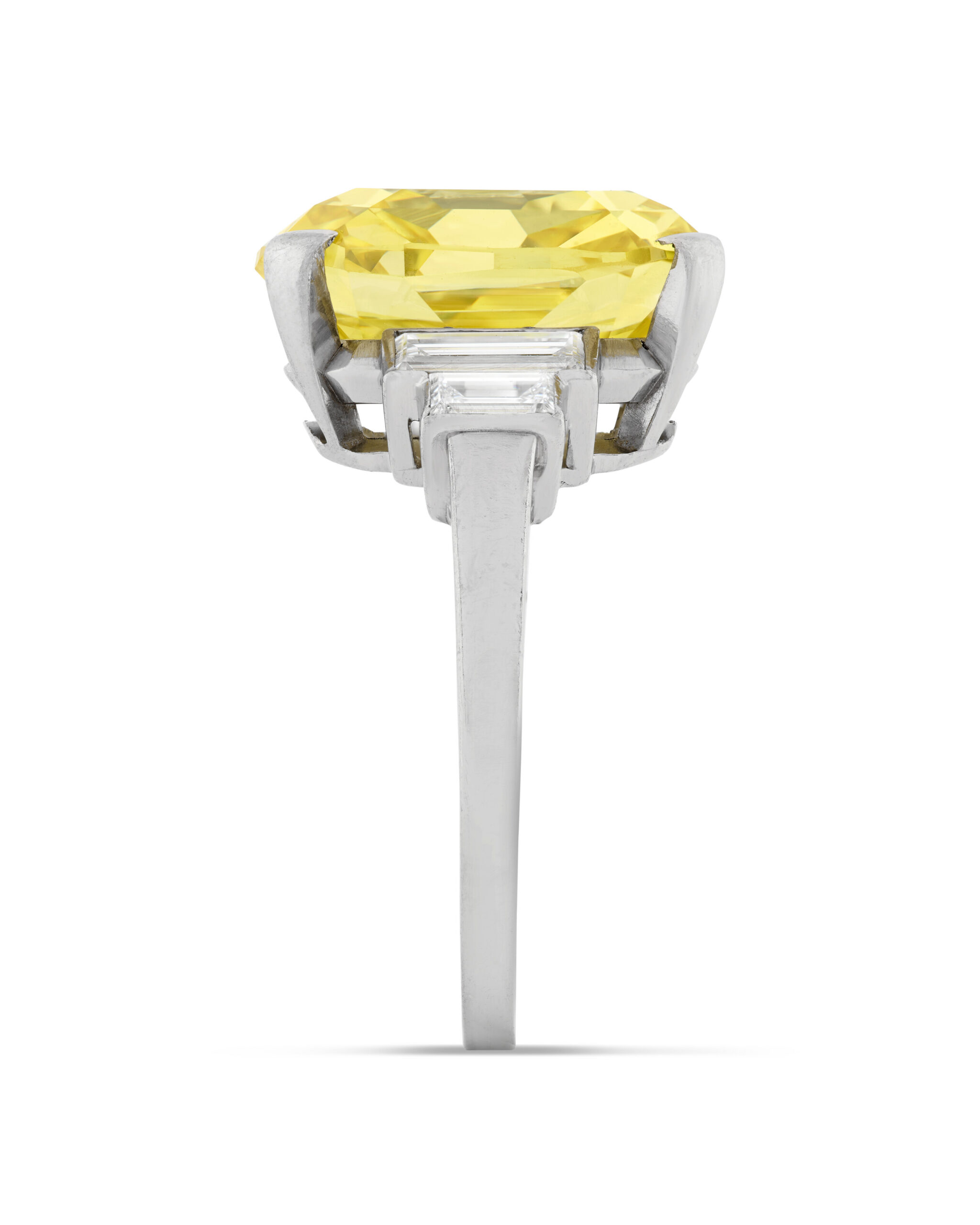 The restrained metalwork is deliberately secondary, so the fancy colour diamonds and their Fancy Yellow character define the mood and identity of the ring entirely.