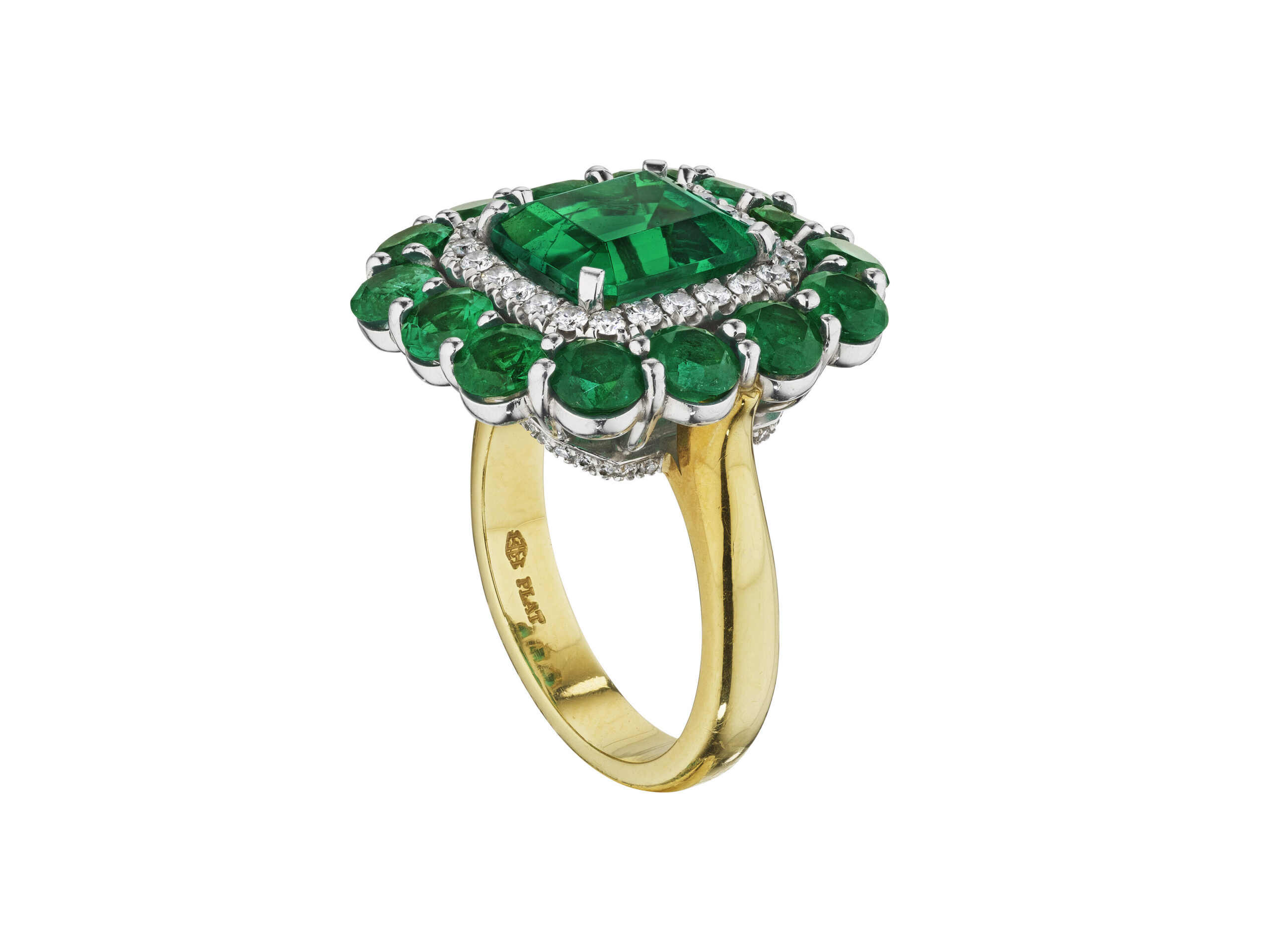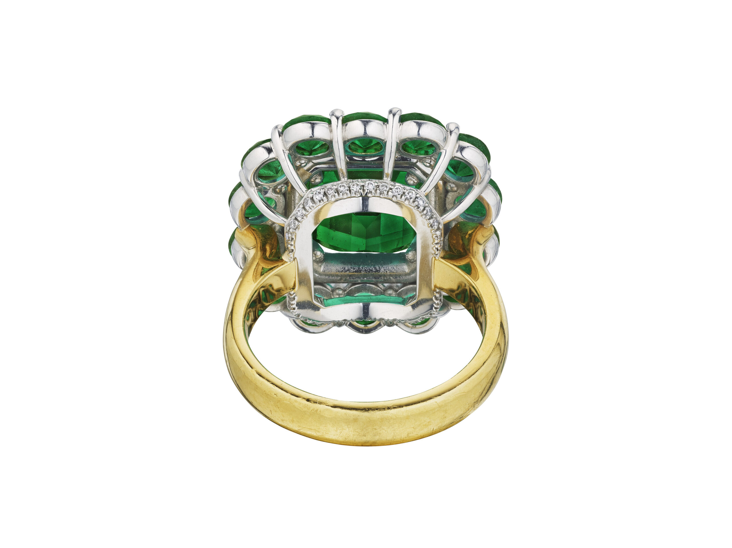 Viewed from the side as well as from above, the architecture reveals how carefully the gemstones are staged. The approximately 10 carats of Emerald Green Emerald cut diamonds are set at slightly graduated heights and tilts so they catch and return light to the viewer from multiple directions.