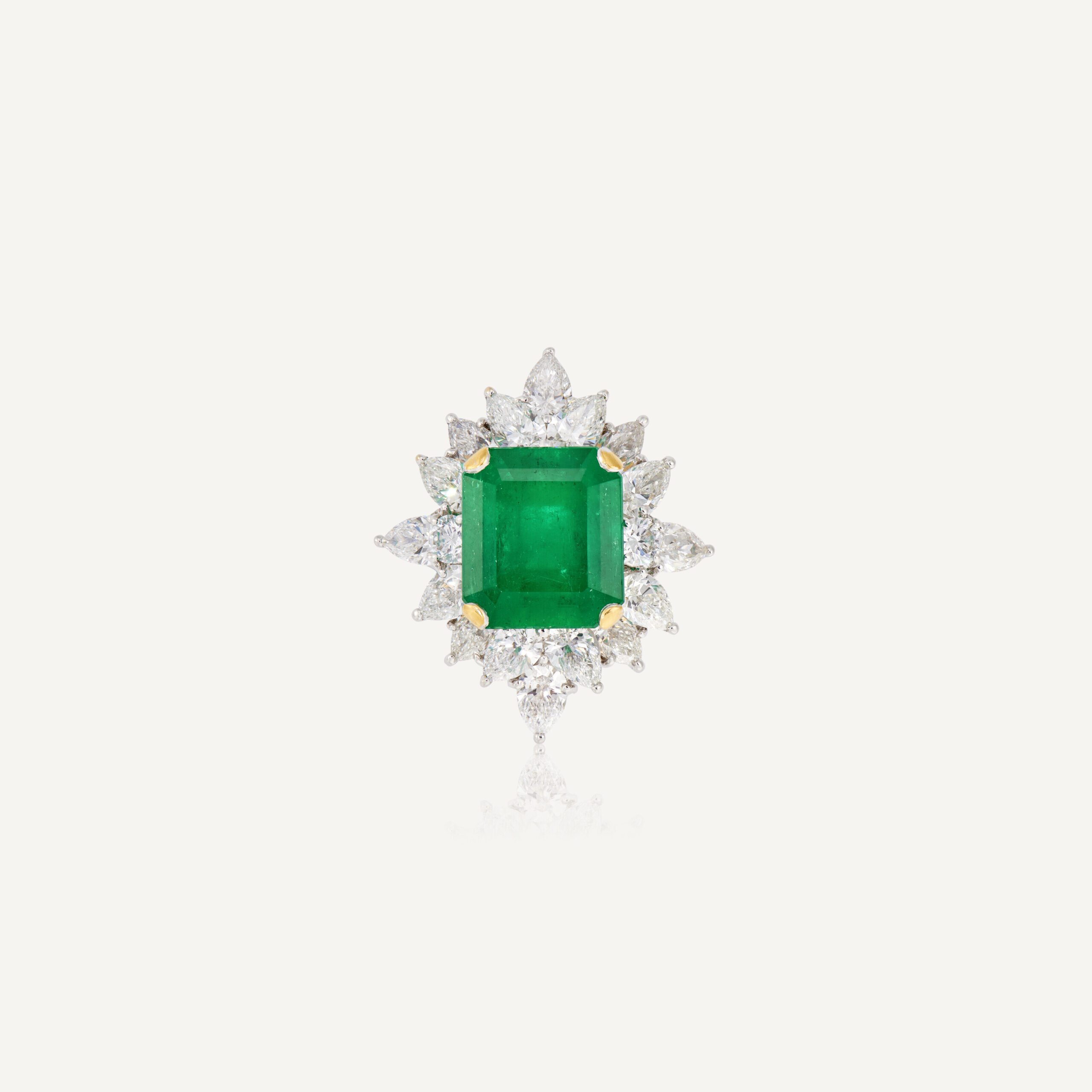 Approximately 10 carats, emerald, statement ring, diamond ring. A connoisseur-led design where the face-up stays calm, crisp, and intentionally luxurious. Colour family: Emerald Green. Every decision is made for visual integrity: even sparkle, clean outline, and a flattering look across lighting conditions. The craftsmanship is engineered so the sparkle reads as one surface of lightβnot scattered points competing for attention. Made to be worn often, remembered clearly, and passed forward with pride. High Jewellery Supremacyβa piece defined by brilliance, poise, and longevity.