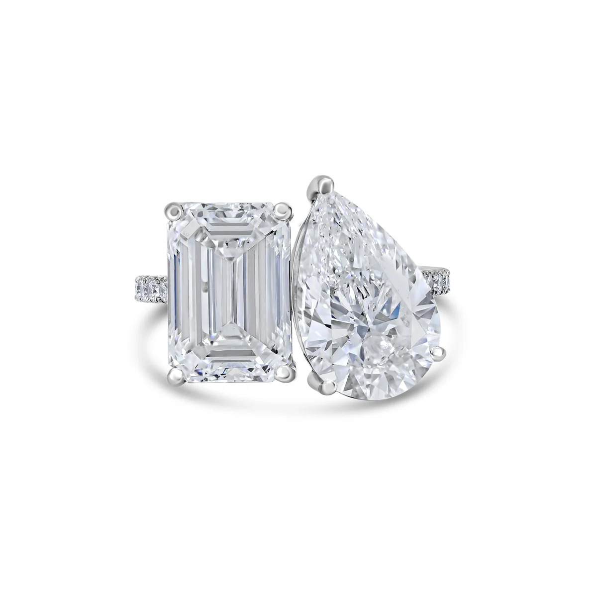 Approximately 10 carats, emerald, toi et moi, diamond ring. Created for those who prefer quiet power—brilliance without chaos. Colour family: Brilliant White. Clarity: VS. Metal: 14K White Gold. Every decision is made for visual integrity: even sparkle, clean outline, and a flattering look across lighting conditions. The craftsmanship is engineered so the sparkle reads as one surface of light—not scattered points competing for attention. Ideal for boardroom-to-black-tie wear, with a look that stays precise under close scrutiny. Unparalleled Brilliance—a piece defined by brilliance, poise, and longevity.