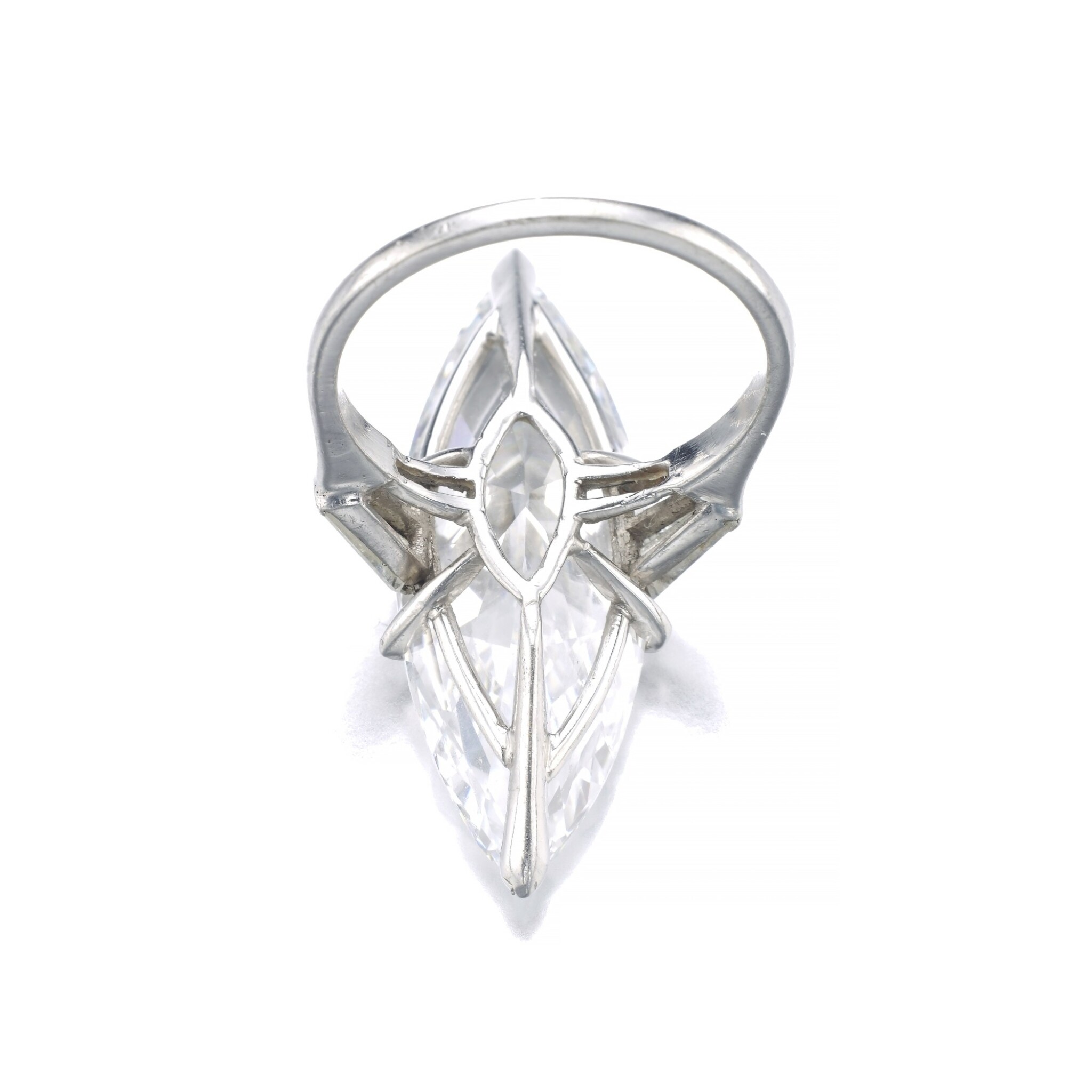 Approximately 10 carats, marquise, statement ring, diamond ring. A modern classic that balances presence with polish, engineered for long-term wear. Colour family: Brilliant White / F color. Clarity: VVS. Metal: 14K White Gold. It wears with authority without shoutingβsubstantial enough to anchor a look, restrained enough to stay timeless. It is the kind of ring that lives well in a serious jewellery wardrobe: confident, clean, and consistently flattering. Made to be worn often, remembered clearly, and passed forward with pride. Purity in Perfectionβa piece defined by brilliance, poise, and longevity.