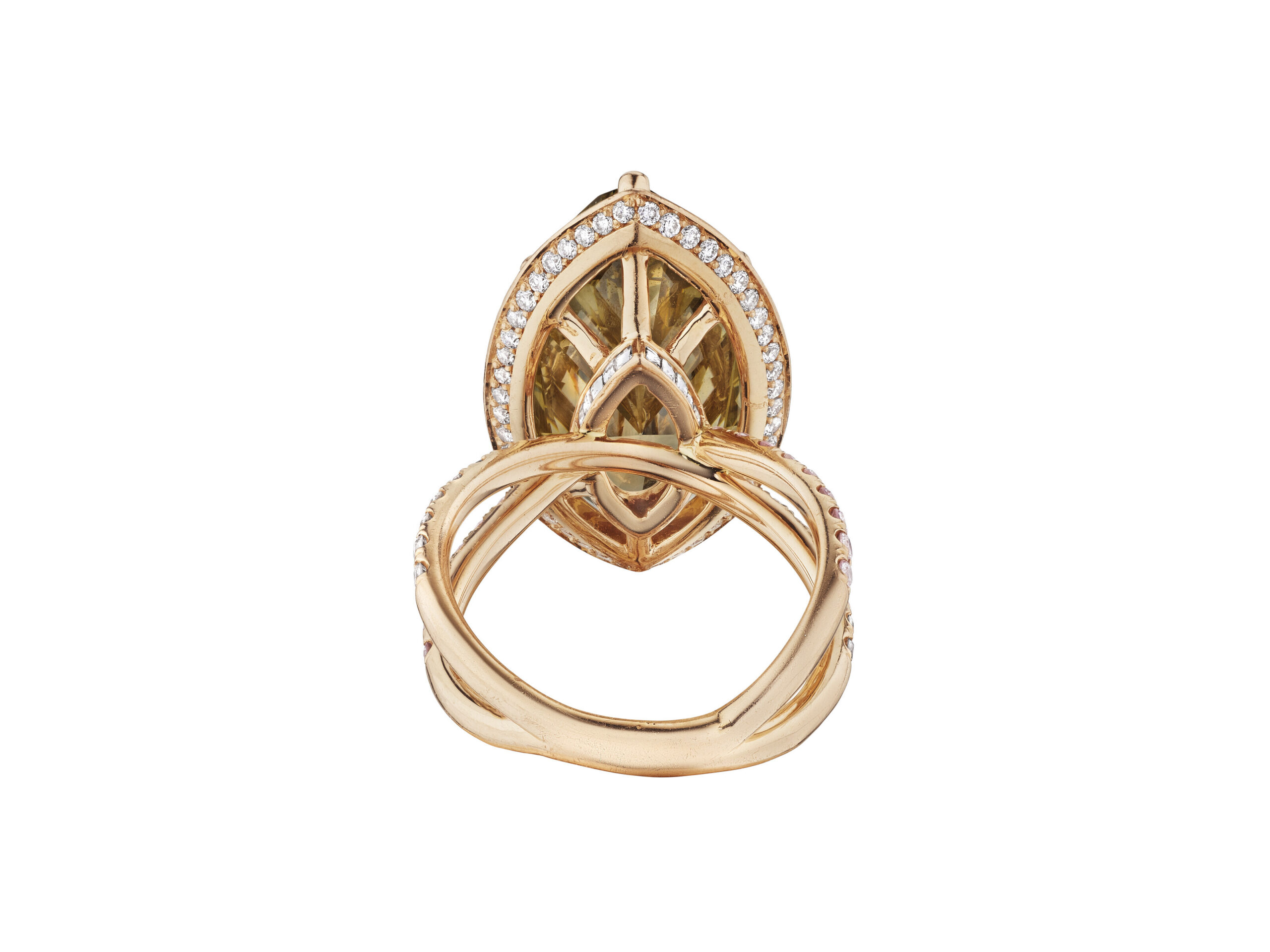 From the first sketch, the aim was unity: approximately 10 carats of Fancy Yellow Marquise diamonds working together as one visual statement. By aligning the fancy colour diamonds in a precise arc and controlling the metal around them, the setting allows light to enter freely and bounce from facet to facet.