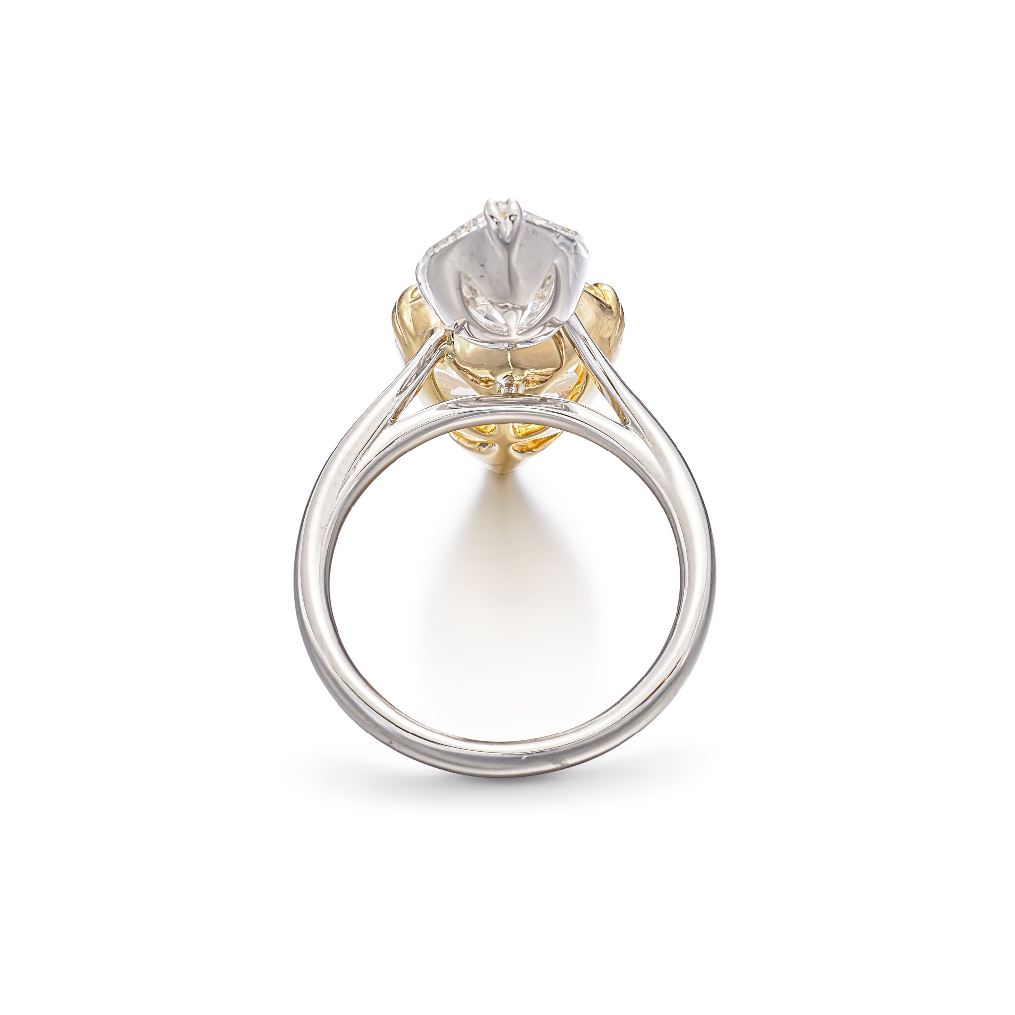 The Fancy Yellow pear shape diamonds are graded and positioned so the eye reads one calm, even surface of brilliance. Subtle transitions in size and angle are used to guide light along the curve of the finger, ensuring the approximately 10 carats of fancy colour diamonds fire together instead of in isolated flashes.