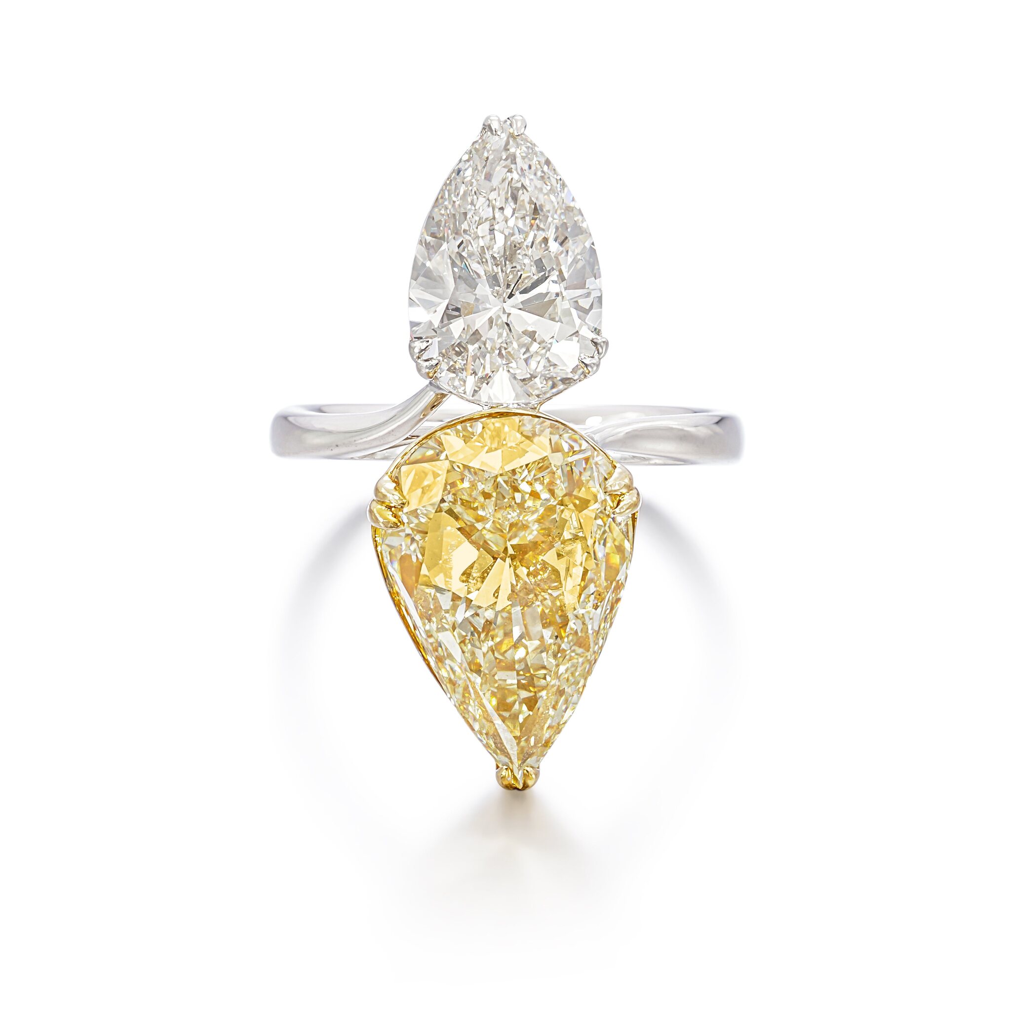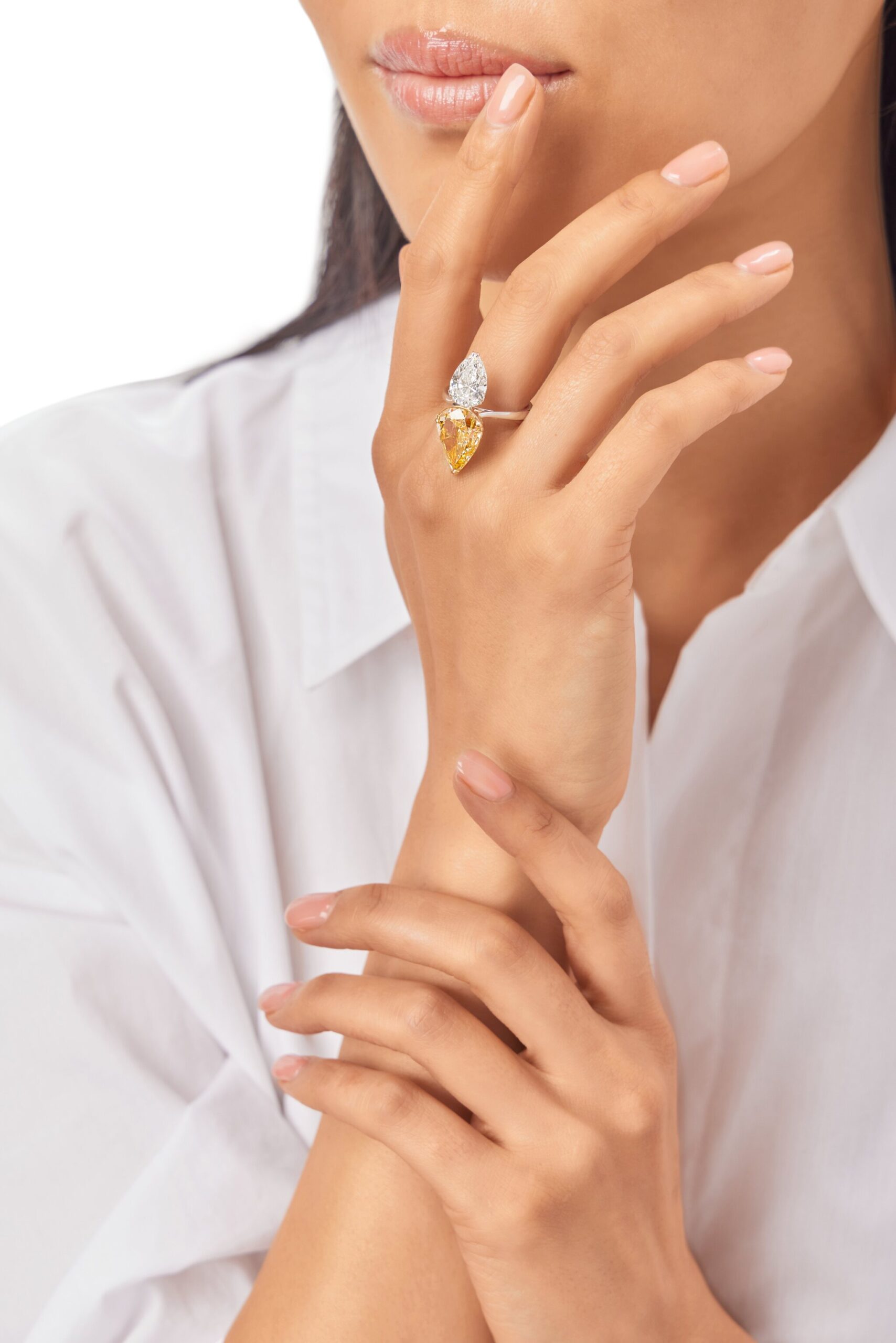 Think of this ring as a piece that edits, rather than complicates, your look. The clean line of the Pear stones and the concentrated 10 carats of Fancy Yellow diamonds reward simple, architectural clothing – column dresses, precise blazers, cashmere knits and well-cut denim all give it room to breathe.