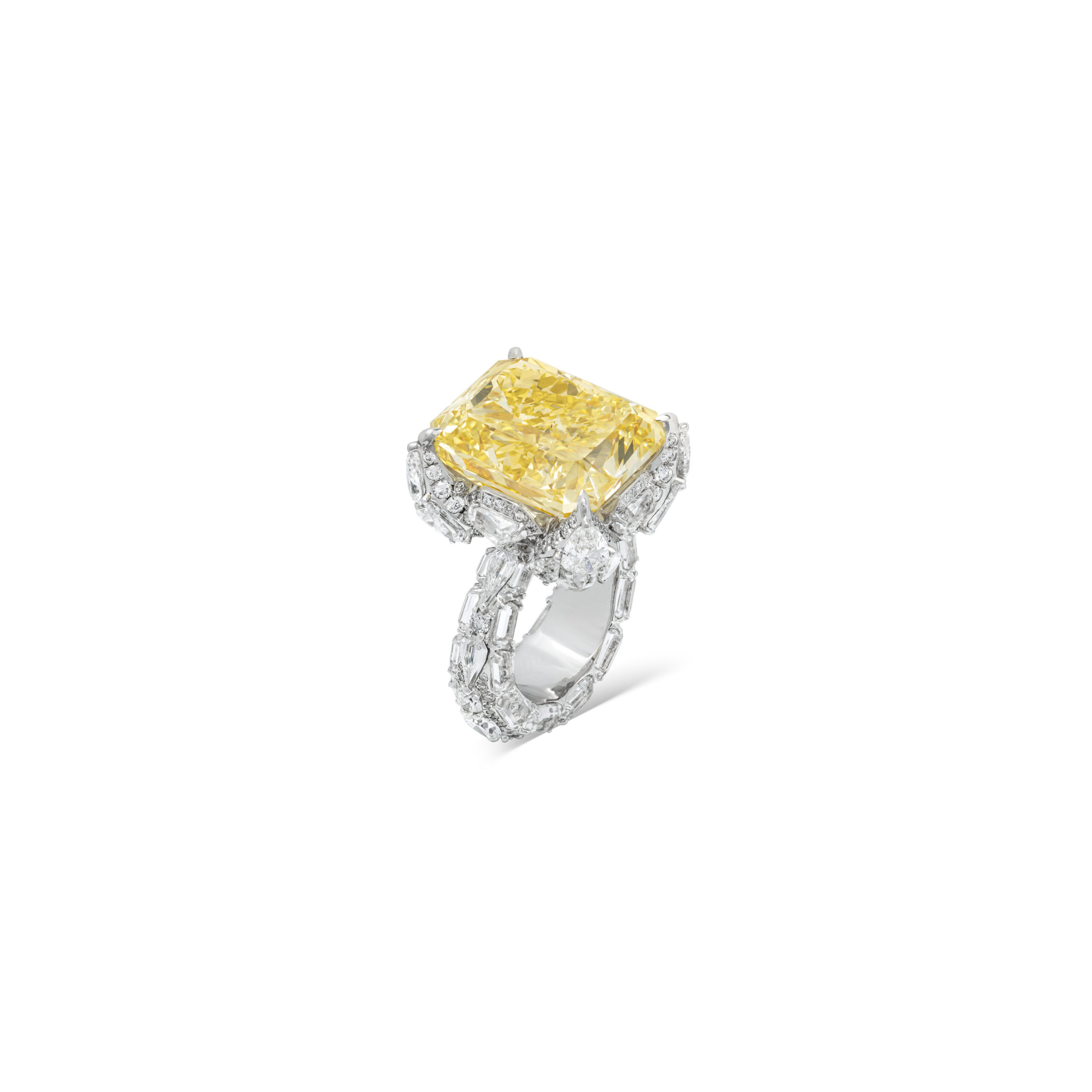 Seats for the fancy colour diamonds are cut, refined and tested under magnification, while the shoulders and shank are tapered so the weight of approximately 10 carats of Fancy Yellow brilliance is distributed comfortably across the finger. This invisible engineering is what allows the ring to feel surprisingly easy to wear, even though it lives firmly in the world of serious high jewelry.