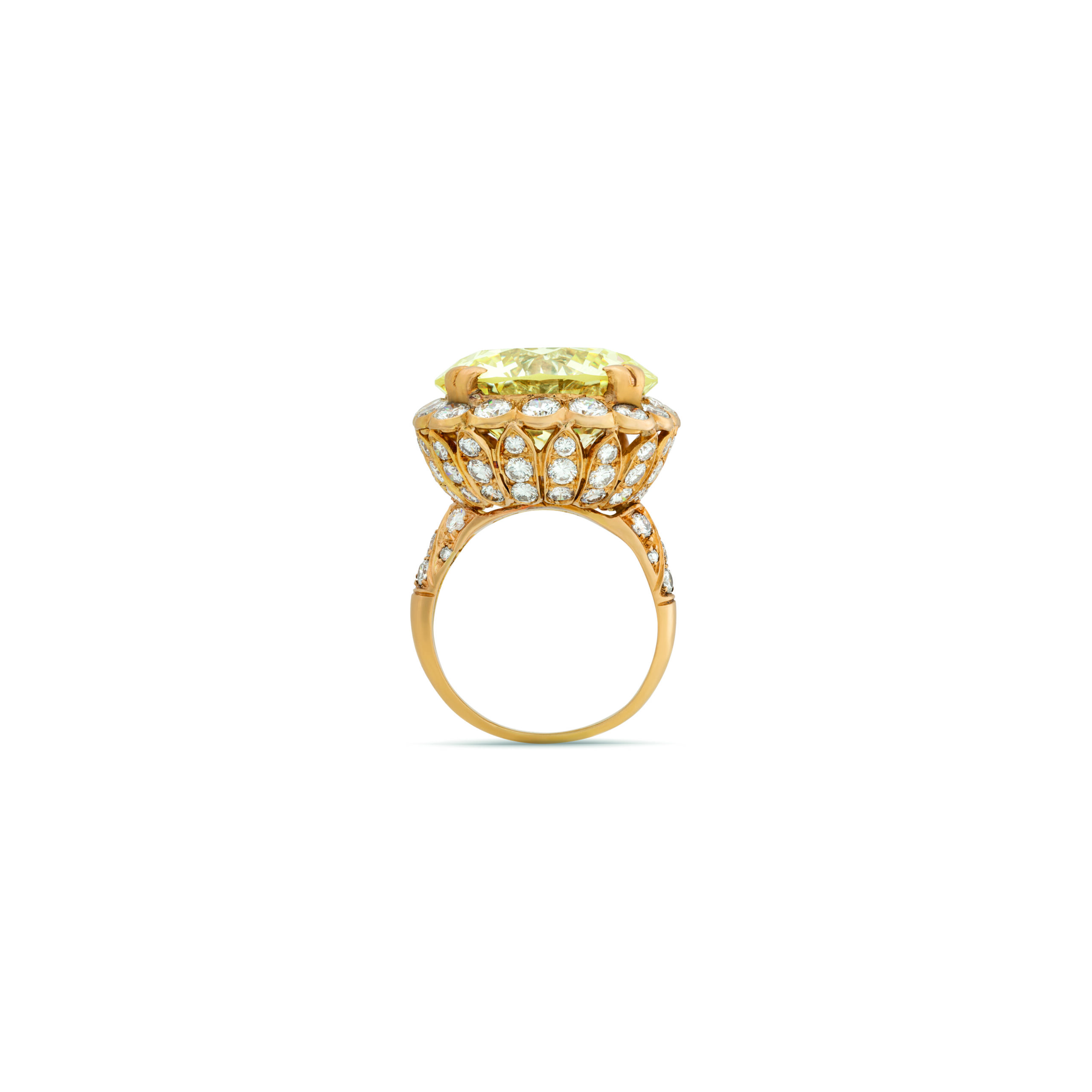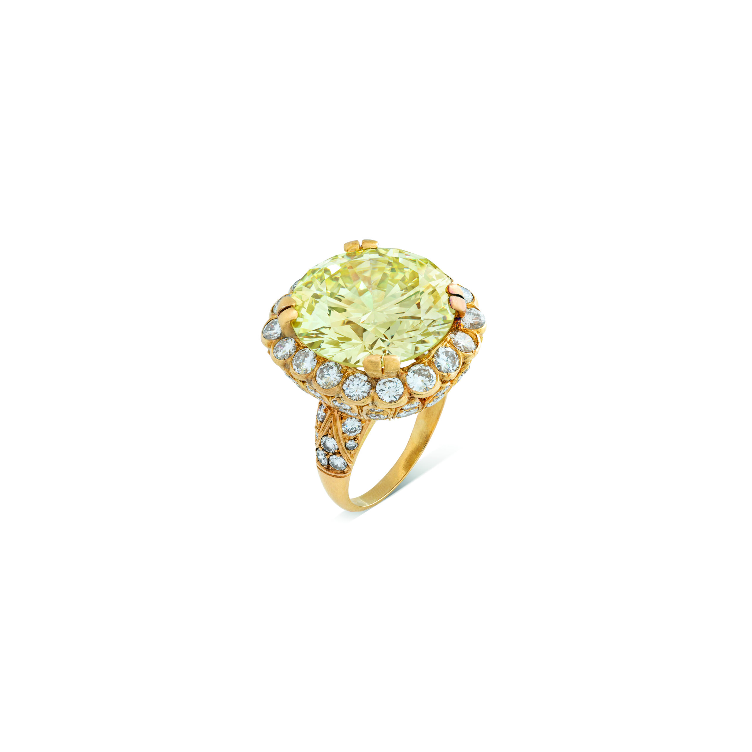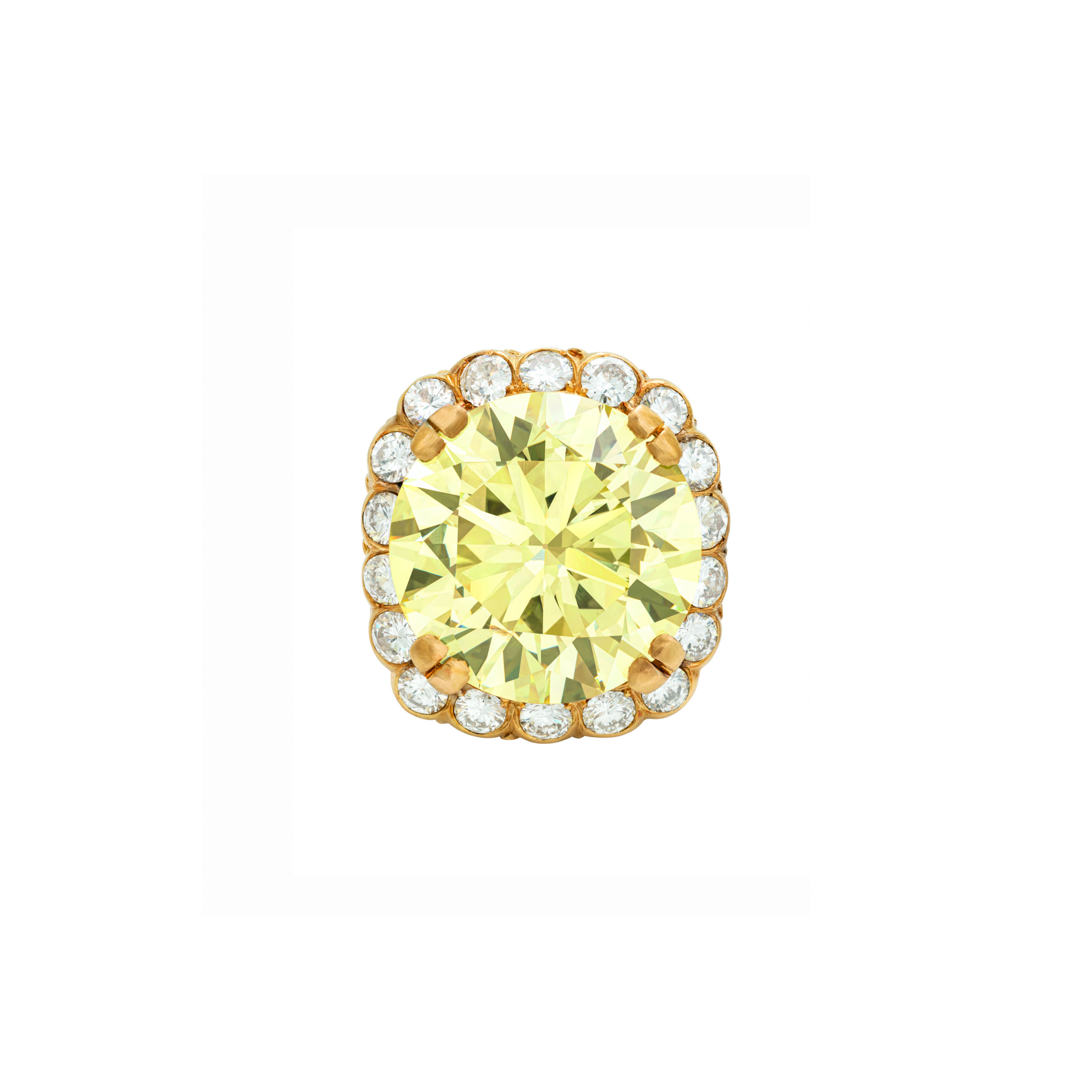 Approximately 10 carats, round brilliant, statement ring, diamond ring. A modern classic that balances presence with polish, engineered for long-term wear. Colour family: Fancy Yellow. Every decision is made for visual integrity: even sparkle, clean outline, and a flattering look across lighting conditions. Its value is in its discipline: the ring looks composed up close and commanding from across a room. An enduring asset in jewel form: beautiful to wear, credible to document. Rare Fancy-Color Splendourβ€”a piece defined by brilliance, poise, and longevity.