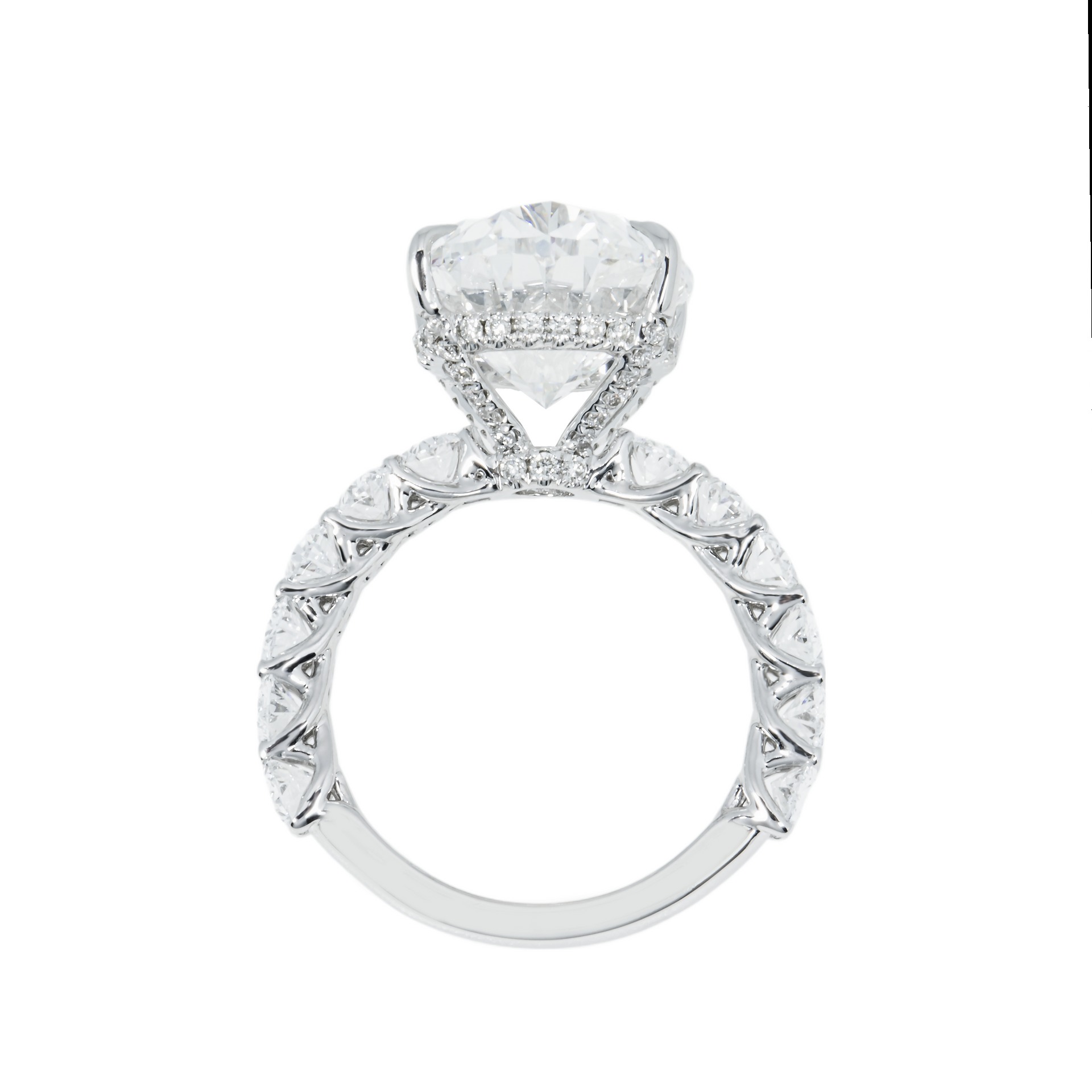 Rather than simply lining up diamonds, this design treats the approximately Carat weight on request of Brilliant White oval diamonds as a single architectural element. Heights, table alignments and spacing are carefully tuned so light can travel cleanly from one diamonds to the next, amplifying the shimmer across the full width of the ring.