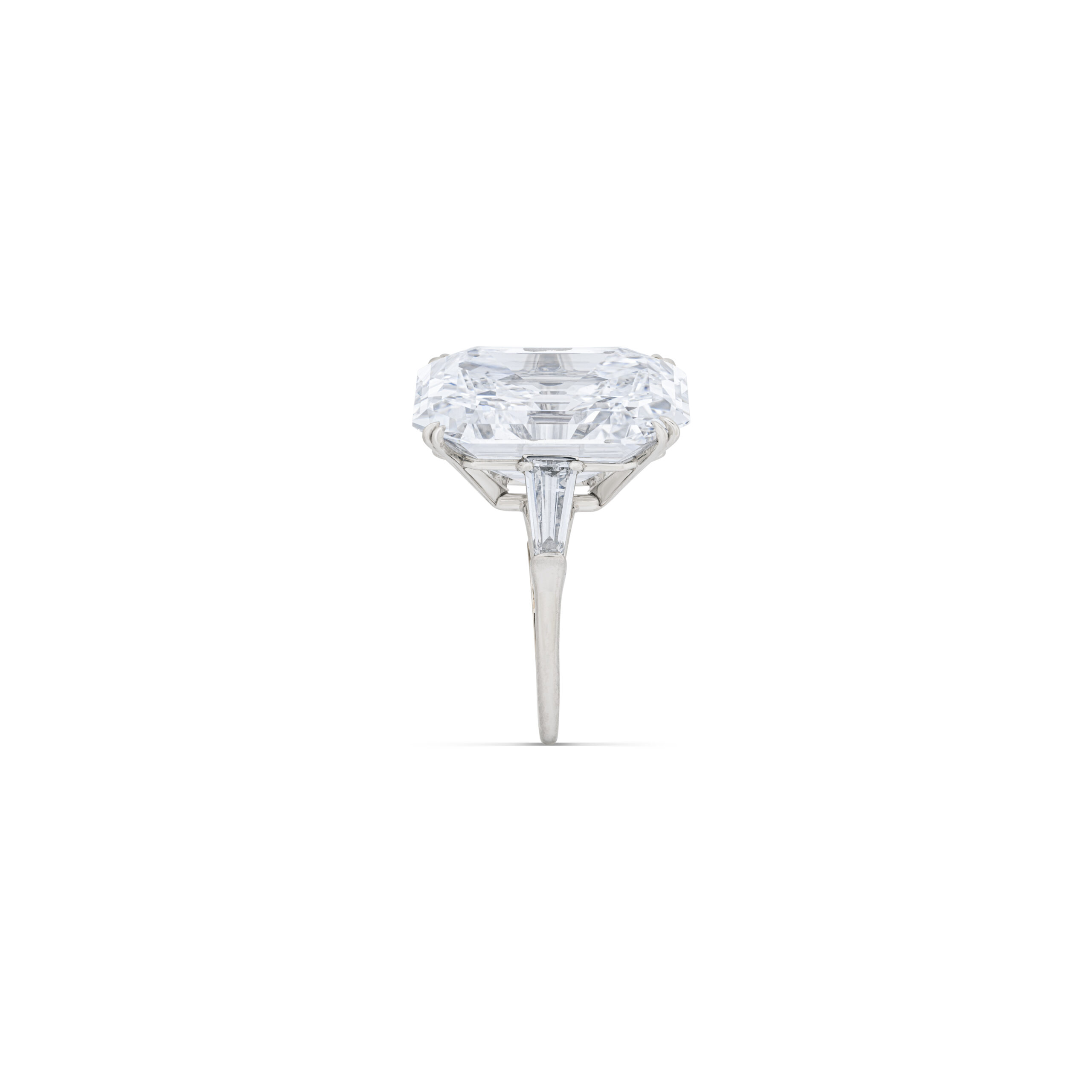 At the heart of this ring sits approximately 14 carats of meticulously selected Brilliant White Emerald cut diamonds, arranged to create a continuous plane of light across the finger.