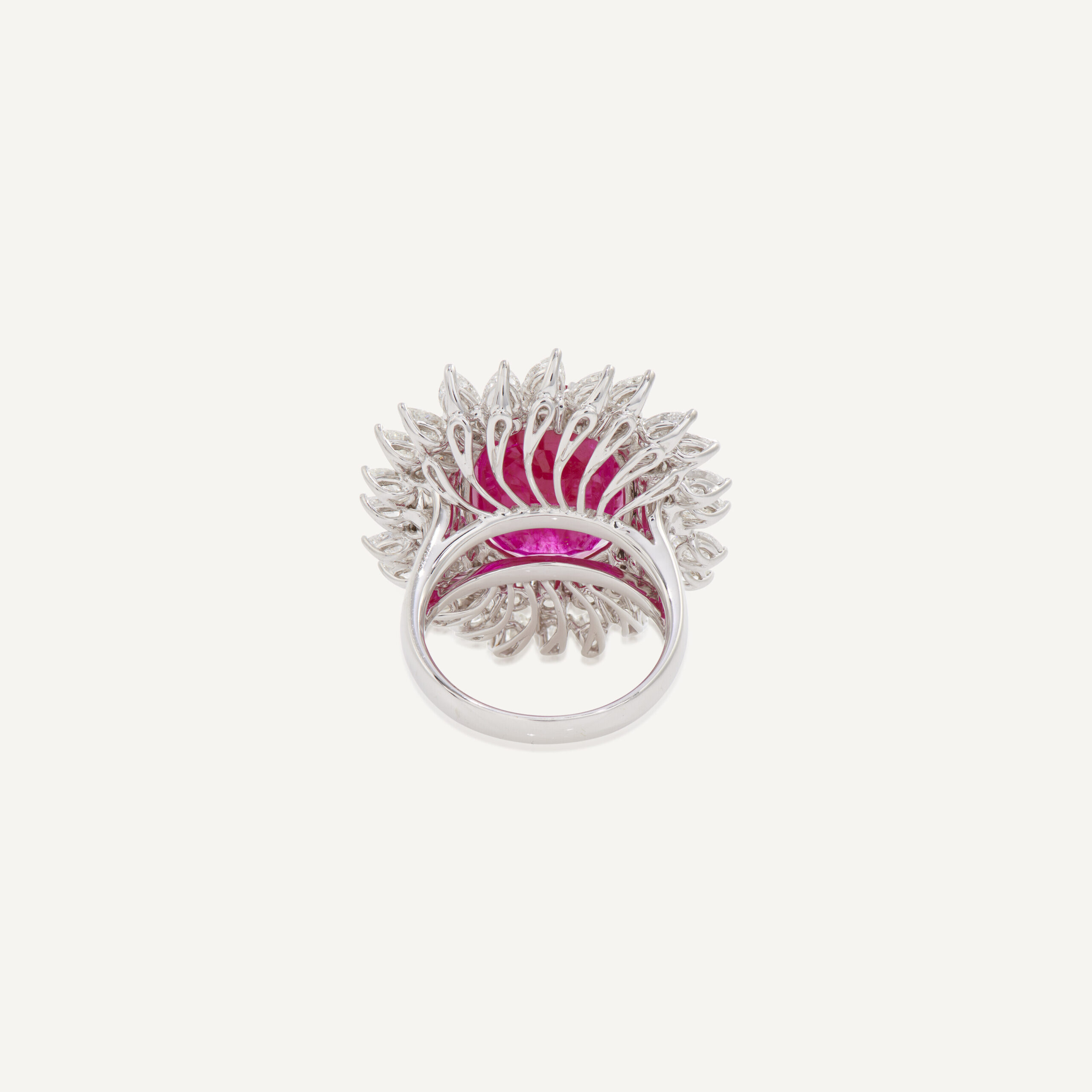 Approximately 14 carats, round brilliant, statement ring, diamond ring. A serious diamond ring with disciplined selection—meant to read clean at normal viewing distance. Colour family: Ruby Red. Metal: 14K White Gold. The silhouette is disciplined and intentional, designed to keep the piece elegant rather than overstated. It is the kind of ring that lives well in a serious jewellery wardrobe: confident, clean, and consistently flattering. For clients who invest in fewer, better jewels—and want that decision to show. High Jewellery Supremacy—a piece defined by brilliance, poise, and longevity.