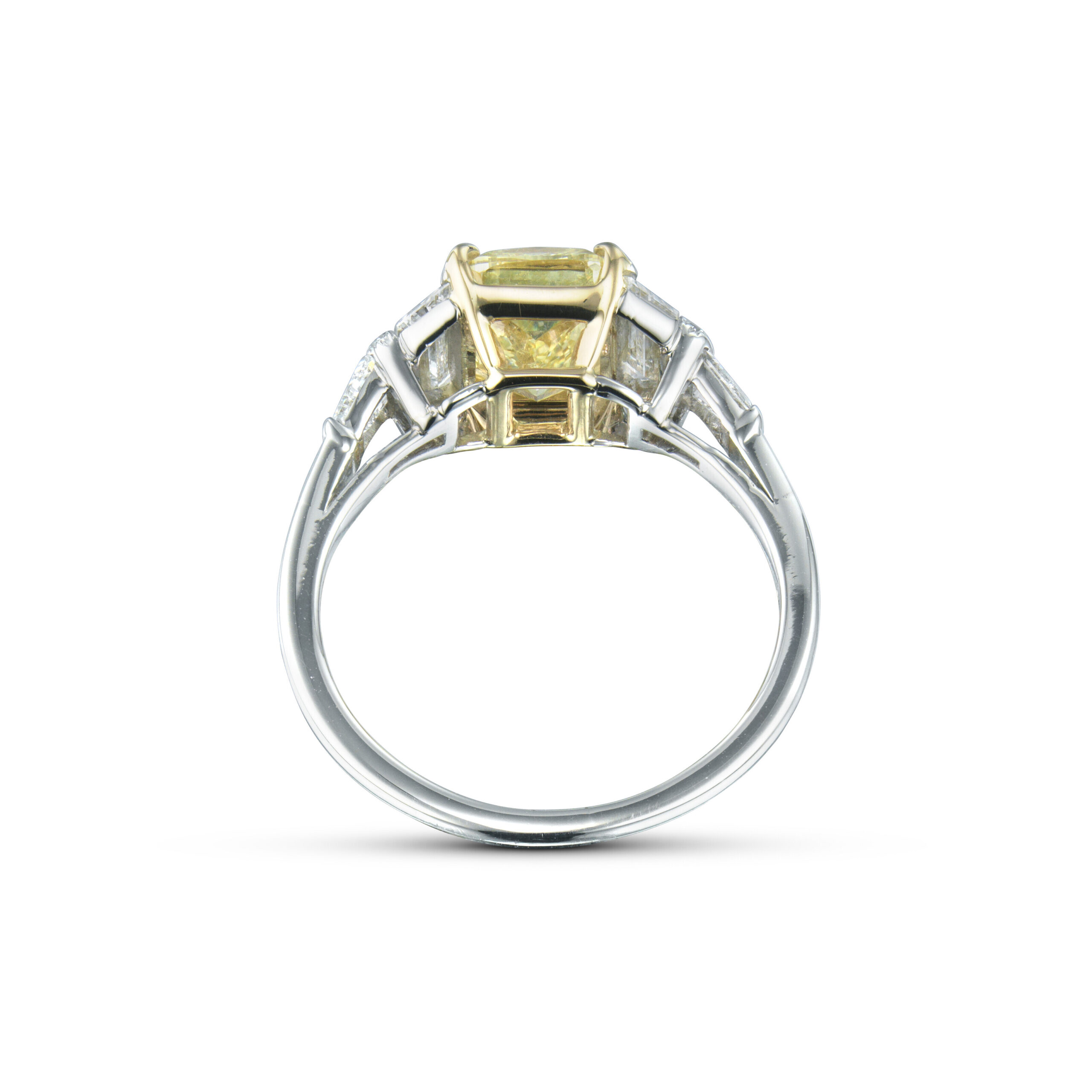 The restrained metalwork is deliberately secondary, so the fancy colour diamonds and their Fancy Yellow character define the mood and identity of the ring entirely.
