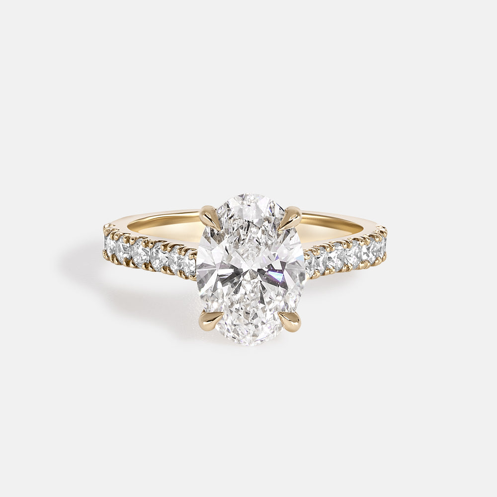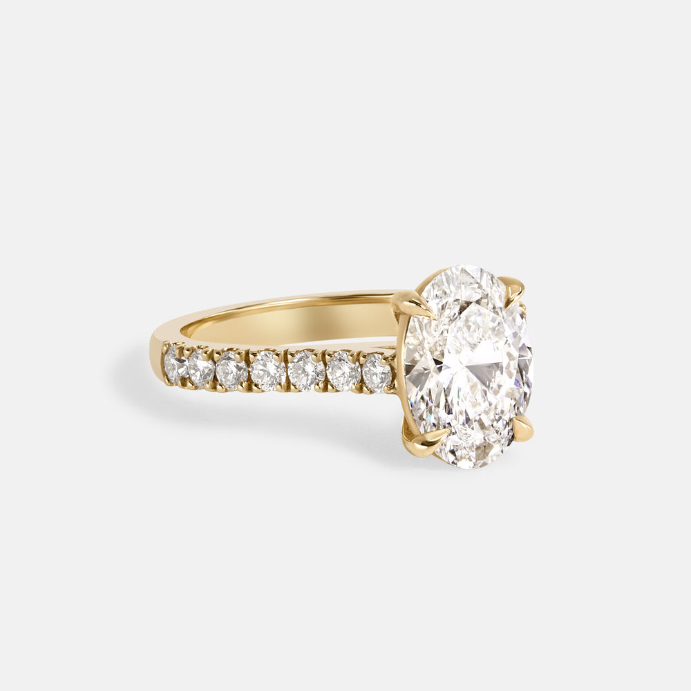 Seen from above it is pure light, but inside the ring there is a great deal of quiet discipline. Legacy goldsmiths first block out a stable, low-slung architecture in 14K White Gold, deciding exactly how the diamonds should travel across the finger and how the Oval line should present itself from every angle.