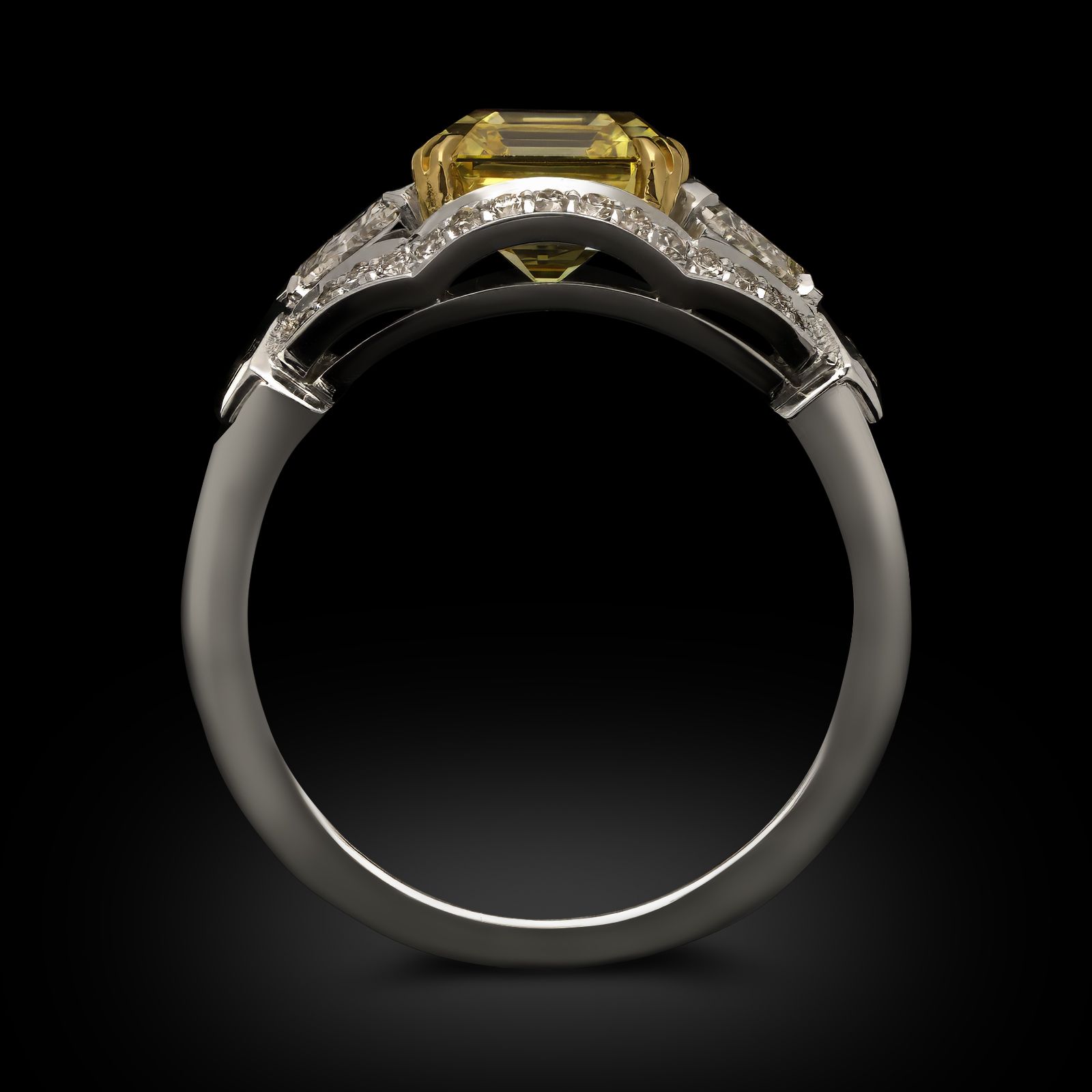 Approximately 2.12 carats, asscher, diamond ring. A modern classic that balances presence with polish, engineered for long-term wear. Colour family: Fancy Yellow. Every decision is made for visual integrity: even sparkle, clean outline, and a flattering look across lighting conditions. Collectors appreciate how it stays coherent from every angle—no noisy flashes, just controlled brilliance. For clients who invest in fewer, better jewels—and want that decision to show. Sunlit Royal Radiance—a piece defined by brilliance, poise, and longevity.