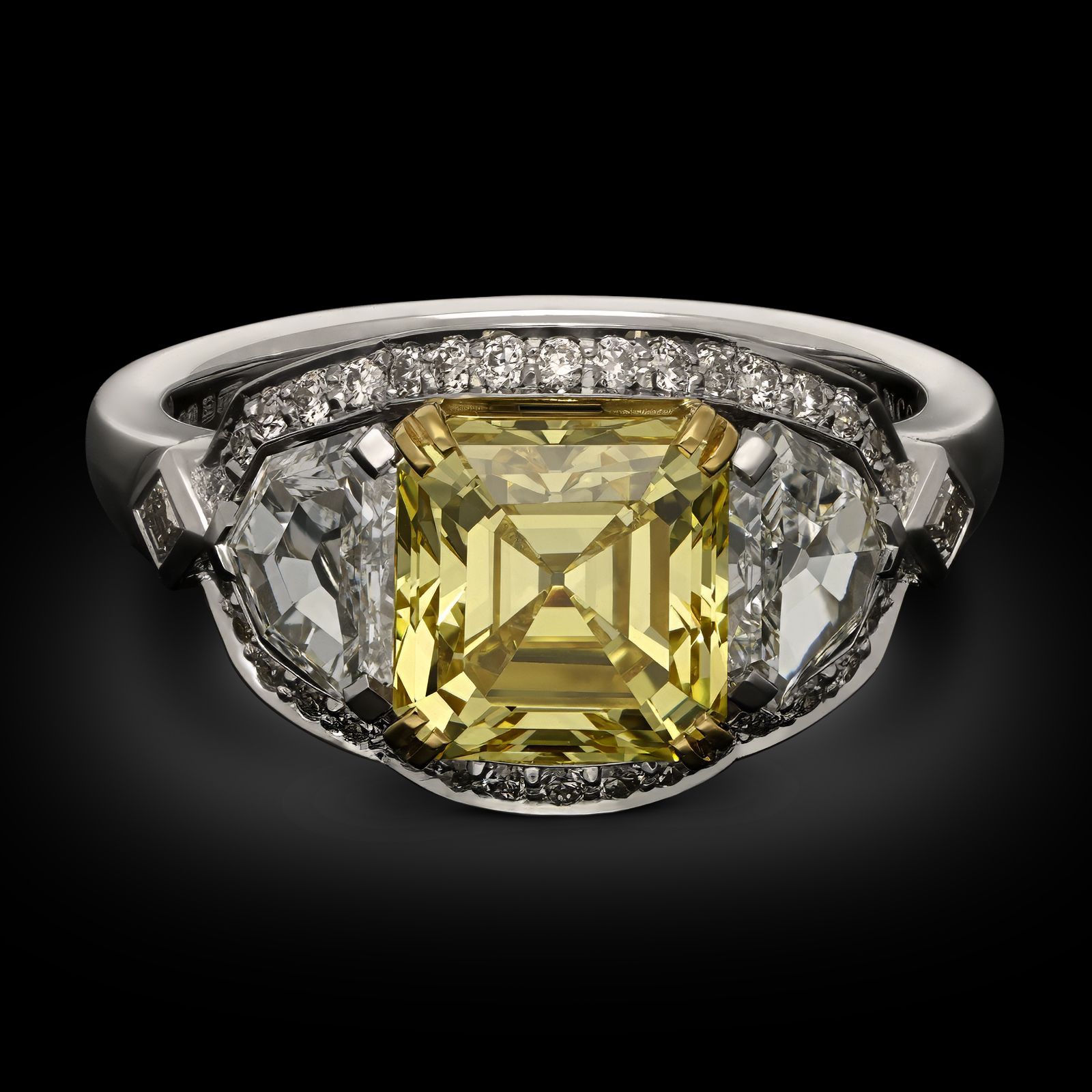 Rather than simply lining up fancy colour diamonds, this design treats the approximately 2.12 carats of Fancy Yellow Asscher diamonds as a single architectural element. Heights, table alignments and spacing are carefully tuned so light can travel cleanly from one fancy colour diamonds to the next, amplifying the shimmer across the full width of the ring.