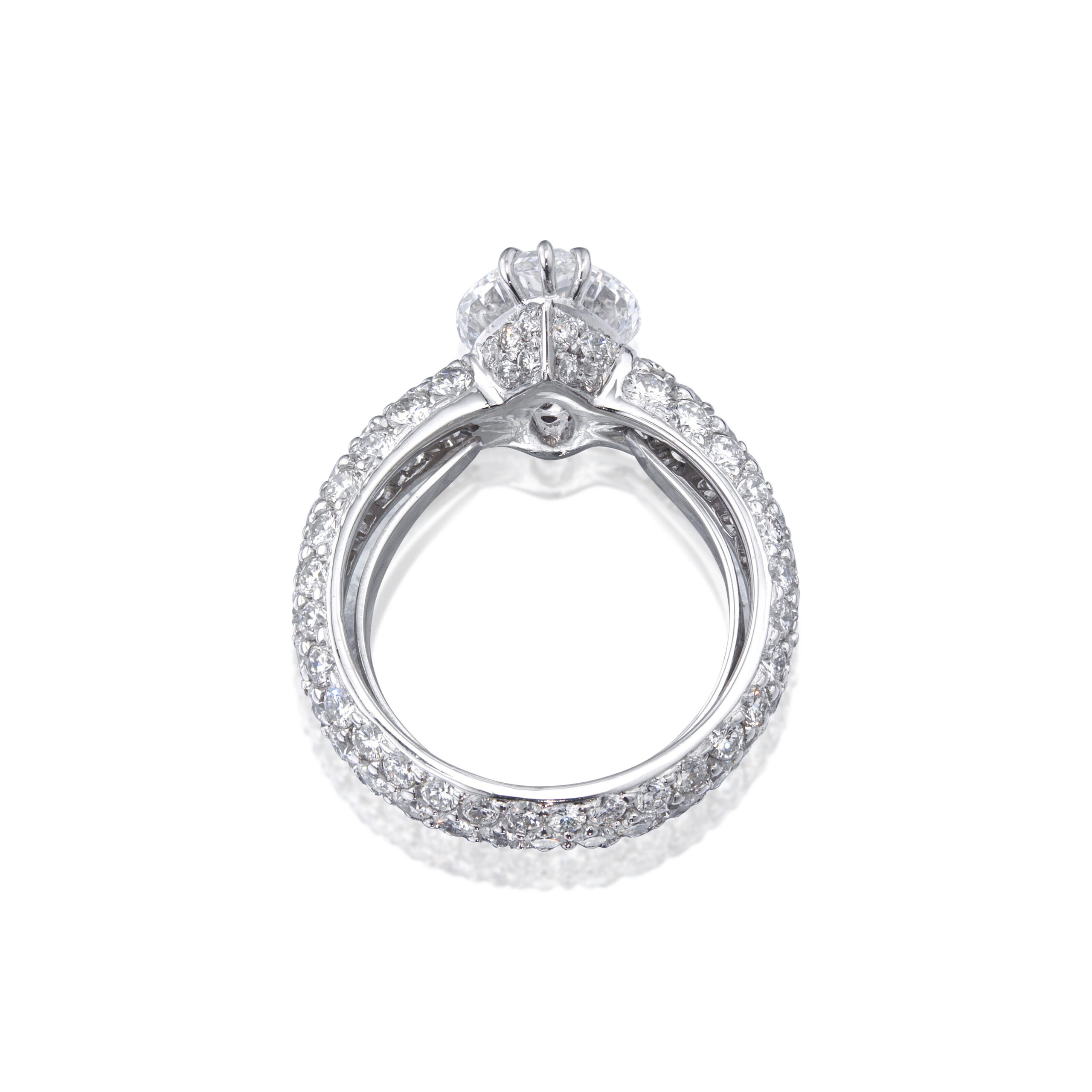 diamonds are screened for a refined face-up appearance: minimal light leakage, a clean table and a harmonious contrast between bright and shaded facets that gives the ring its three-dimensional life.