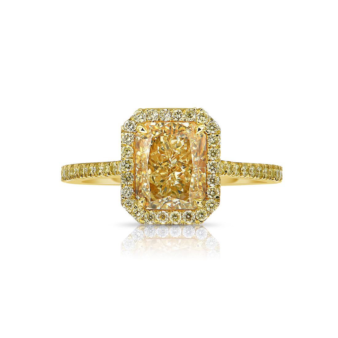 Approximately 2.28 carats, radiant, halo, diamond ring. A collector-facing piece where proportion and light return are treated as non-negotiable. Colour family: Fancy Yellow. It wears with authority without shoutingβsubstantial enough to anchor a look, restrained enough to stay timeless. It is the kind of ring that lives well in a serious jewellery wardrobe: confident, clean, and consistently flattering. Ideal for boardroom-to-black-tie wear, with a look that stays precise under close scrutiny. Colour-Collectorβs Treasureβa piece defined by brilliance, poise, and longevity.