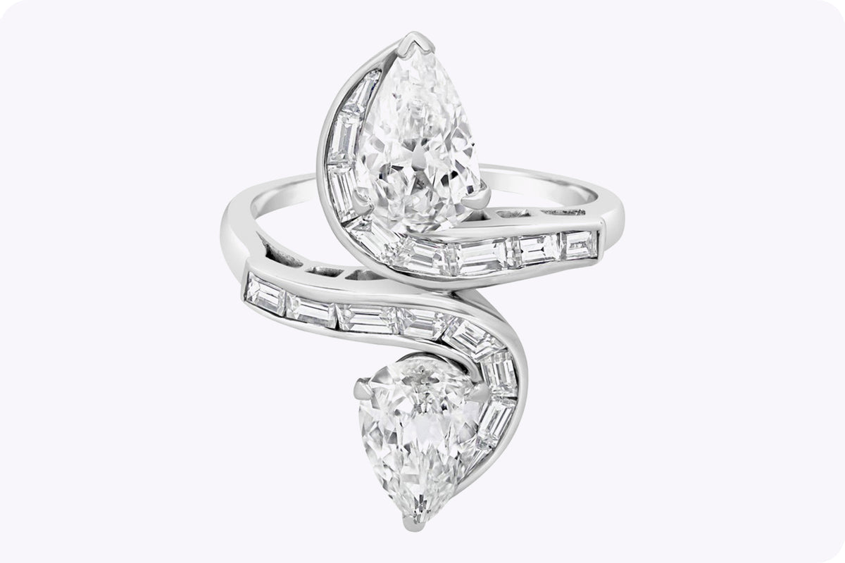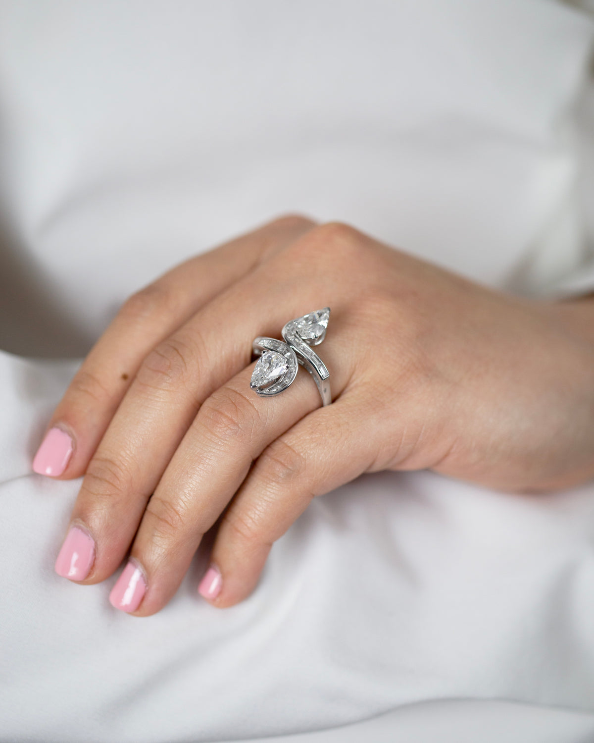 From the first sketch, this design was imagined as a ring that could move seamlessly from gala evenings to private weekends, anchored by approximately 2.48 carats of Brilliant White pear shape diamonds.