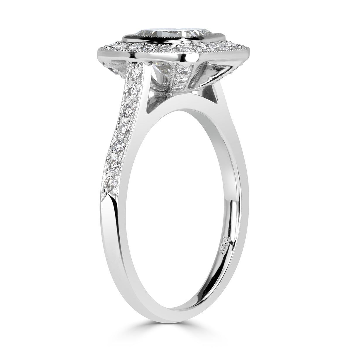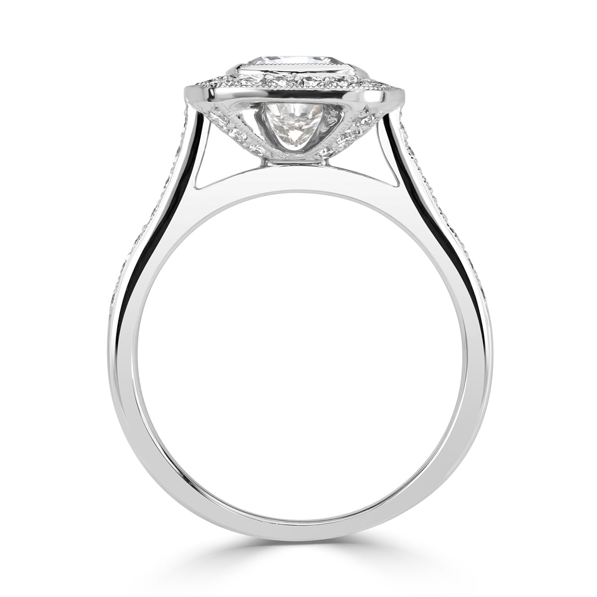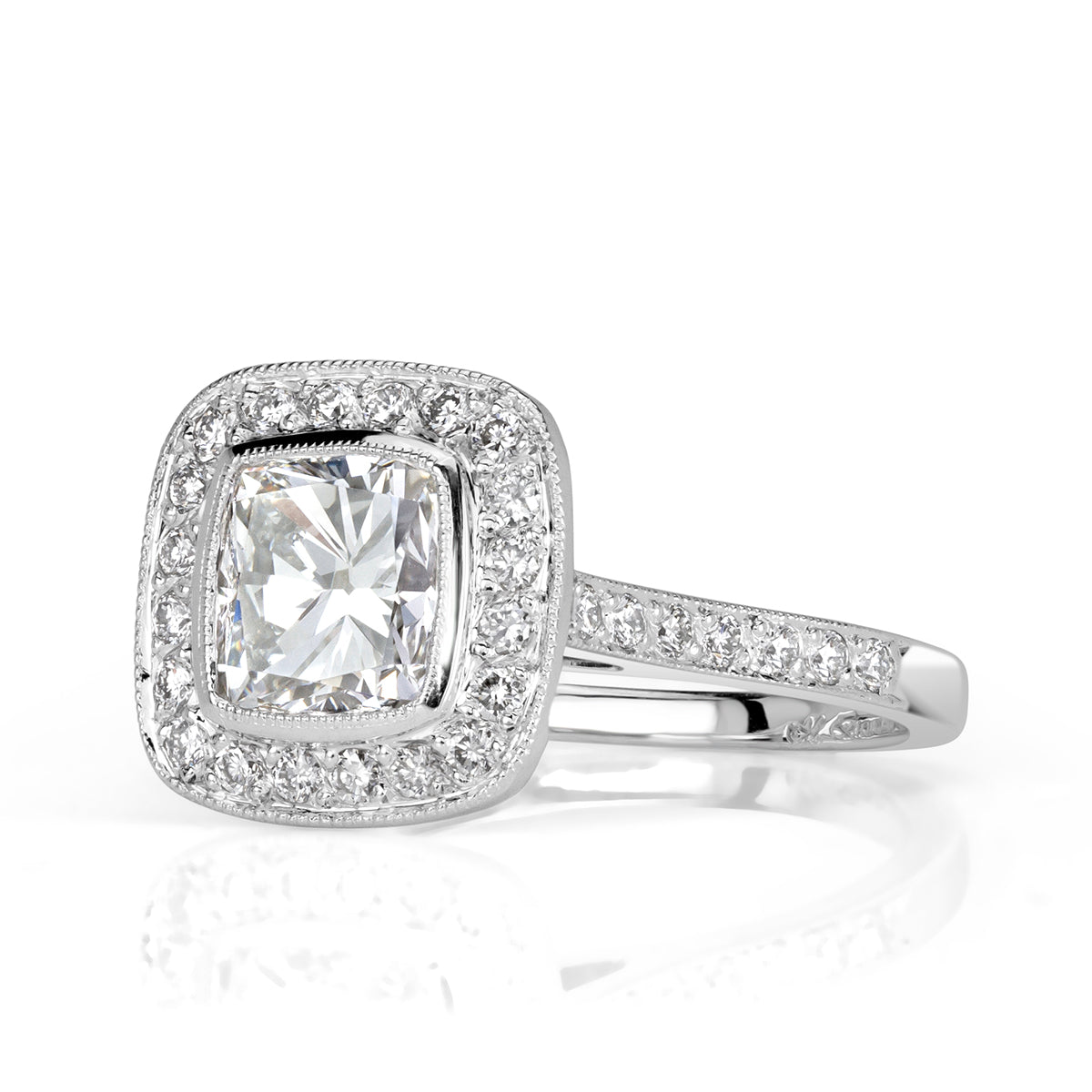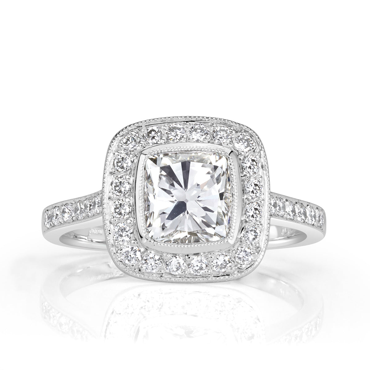 Every diamonds in this design has a job to do. The approximately 2.5 carats of Brilliant White Cushion cut diamonds are arranged so that larger diamonds carry the broad flashes of light, while supporting diamonds fill in the gaps with fine scintillation.