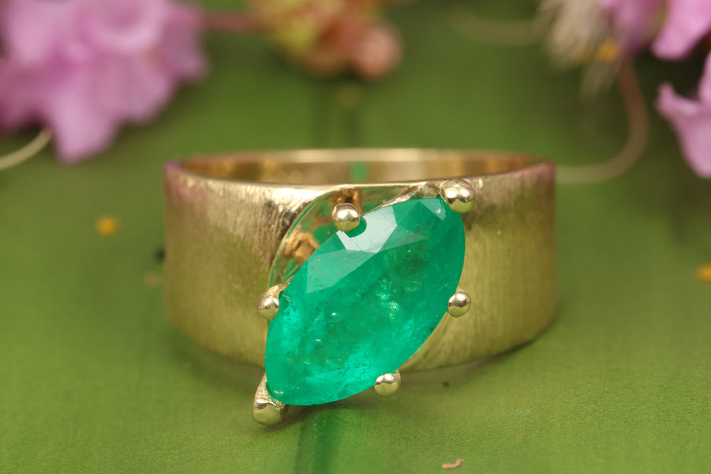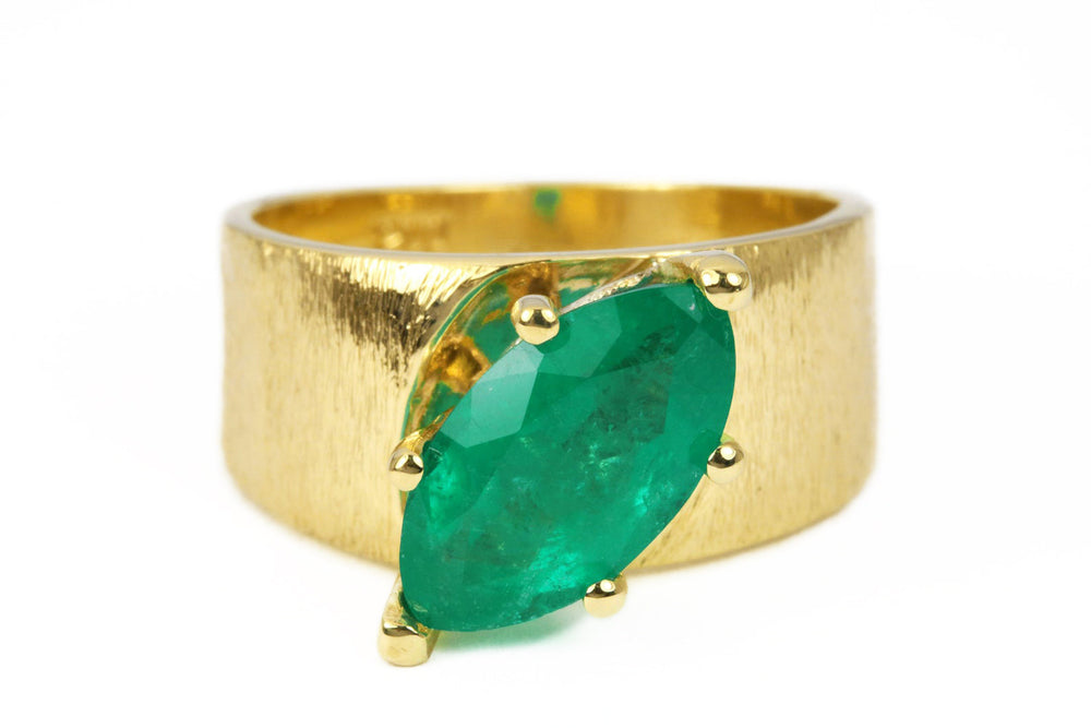 The restrained metalwork is deliberately secondary, so the gemstones and their Emerald Green character define the mood and identity of the ring entirely.