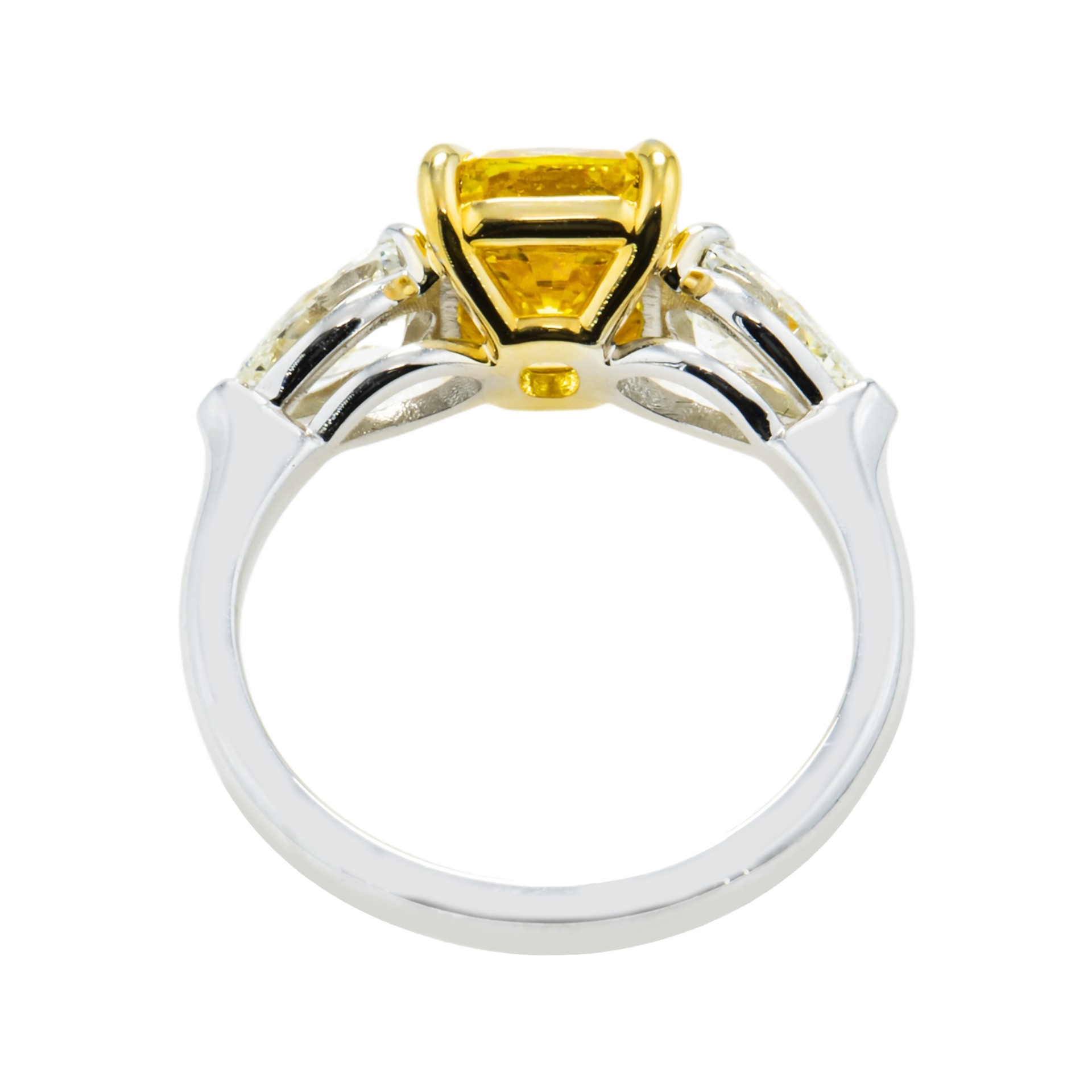 Viewed from any angle, the approximately 2.74 carats of Fancy Yellow Cushion cut diamonds create a wide field of brilliance across the finger. The carat weight is generous enough to be unmistakable in a room, yet balanced so that the ring never feels overpowering.