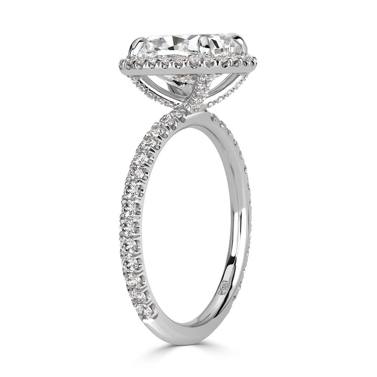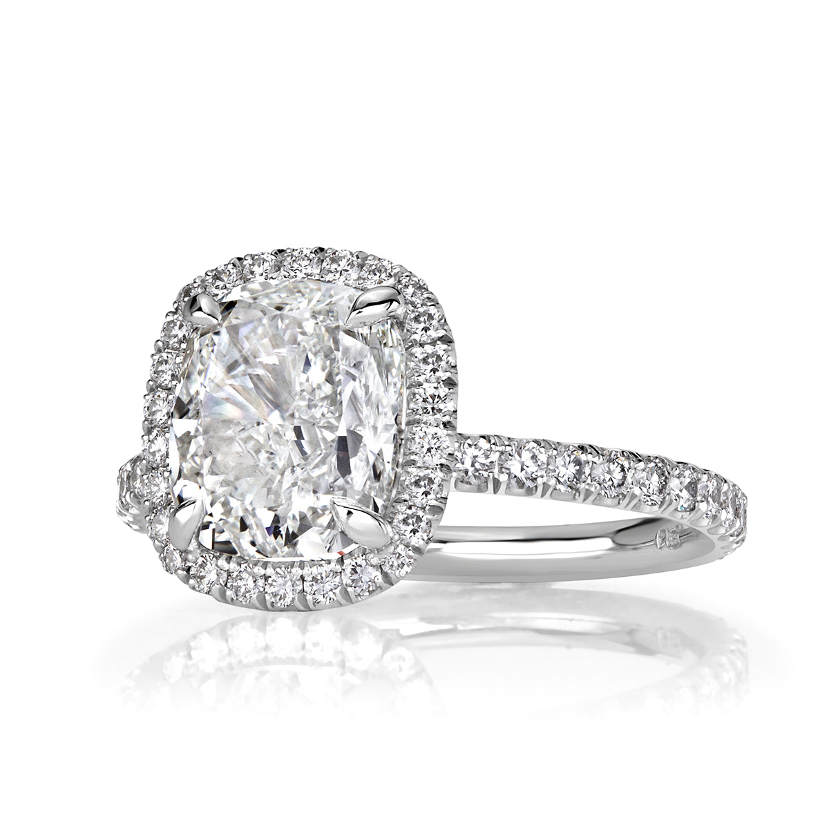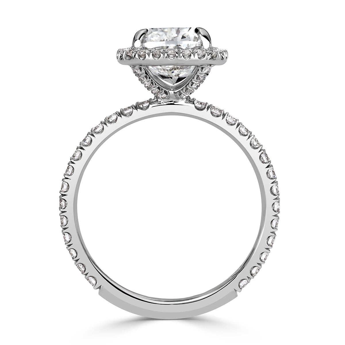 Every diamonds in this design has a job to do. The approximately 2 carats of Brilliant White Cushion cut diamonds are arranged so that larger diamonds carry the broad flashes of light, while supporting diamonds fill in the gaps with fine scintillation.