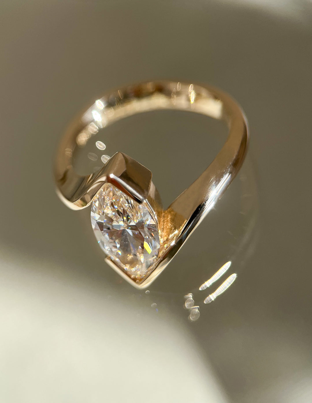 Rather than simply lining up diamonds, this design treats the approximately 2 carats of Brilliant White Marquise diamonds as a single architectural element. Heights, table alignments and spacing are carefully tuned so light can travel cleanly from one diamonds to the next, amplifying the shimmer across the full width of the ring.
