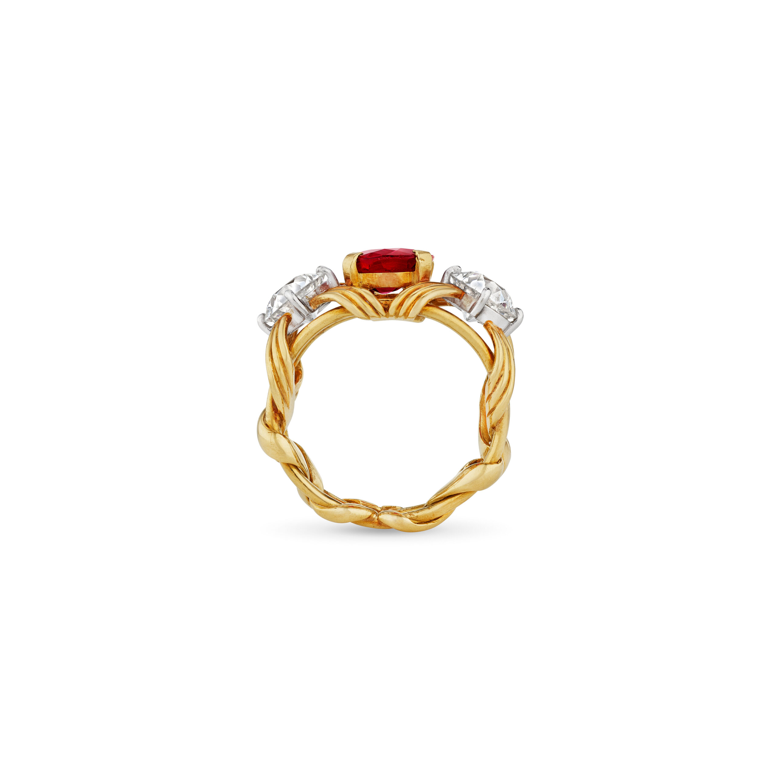 Every diamonds and gemstones in this design has a job to do. The approximately 2 carats of Ruby Red diamonds are arranged so that larger diamonds and gemstones carry the broad flashes of light, while supporting diamonds and gemstones fill in the gaps with fine scintillation.