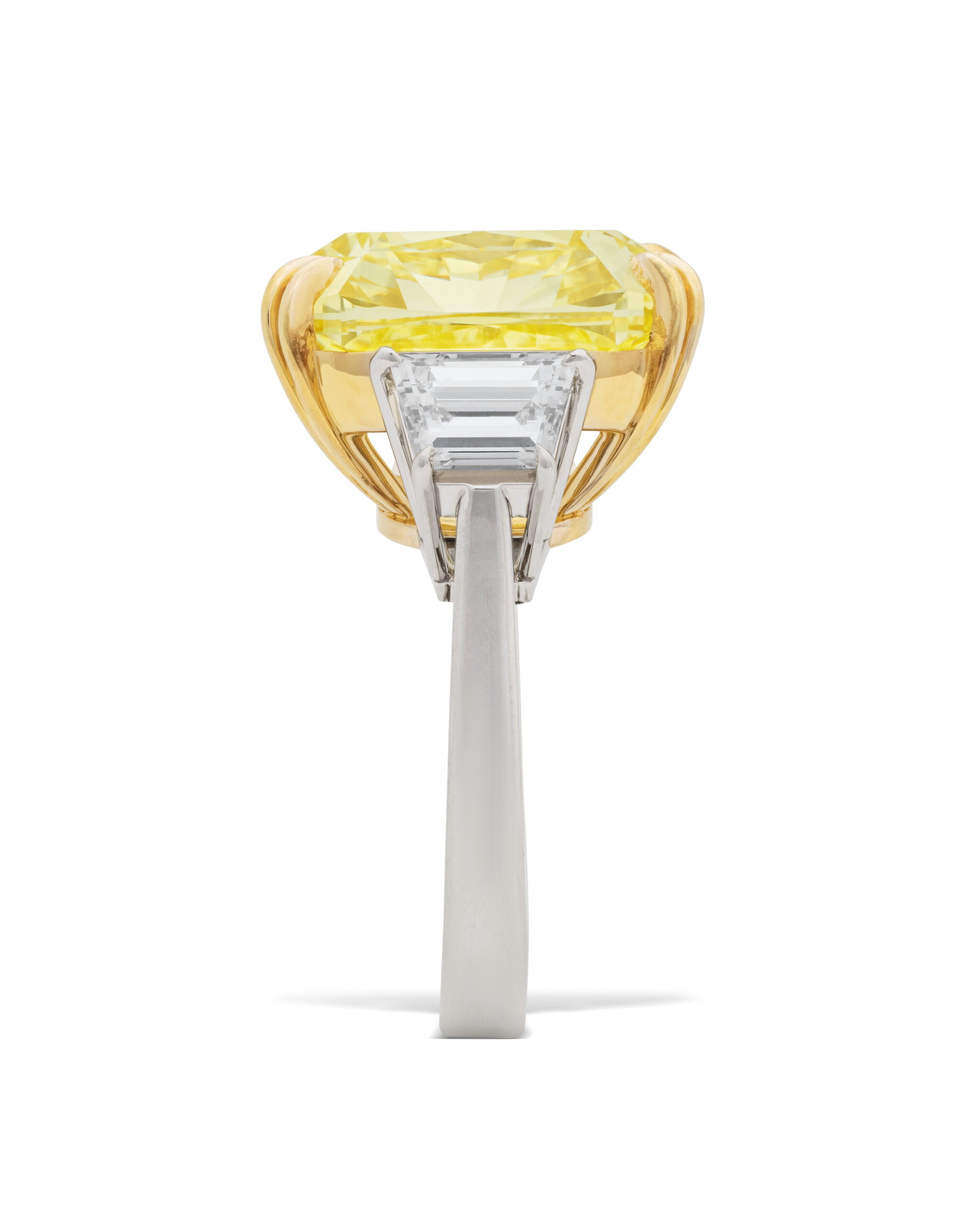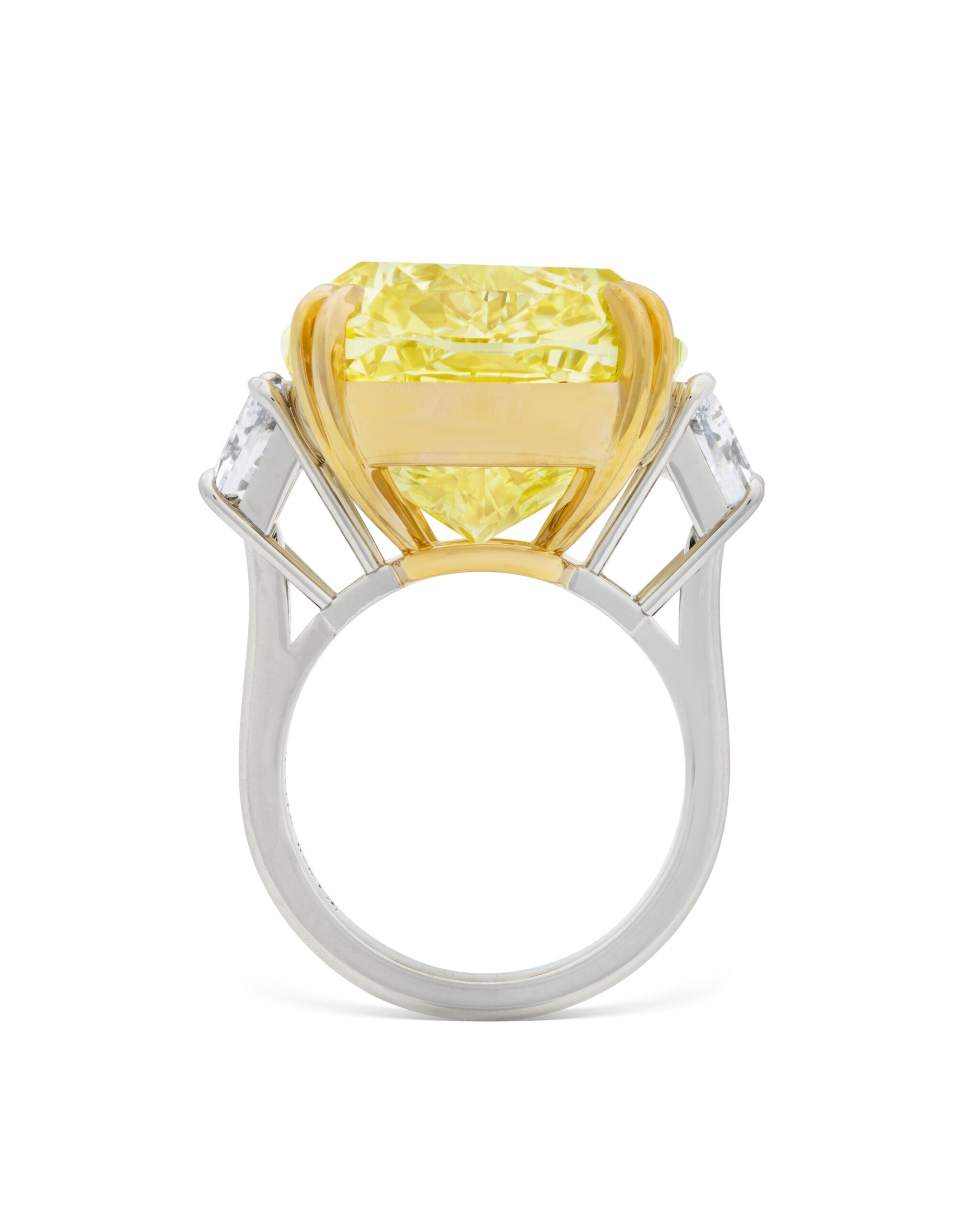 With a total weight of approximately 20 carats, this ring delivers immediate visual presence without losing its elegance. The continuous surface of Fancy Yellow light is calibrated so it feels substantial on the hand while remaining comfortable for long hours of wear.