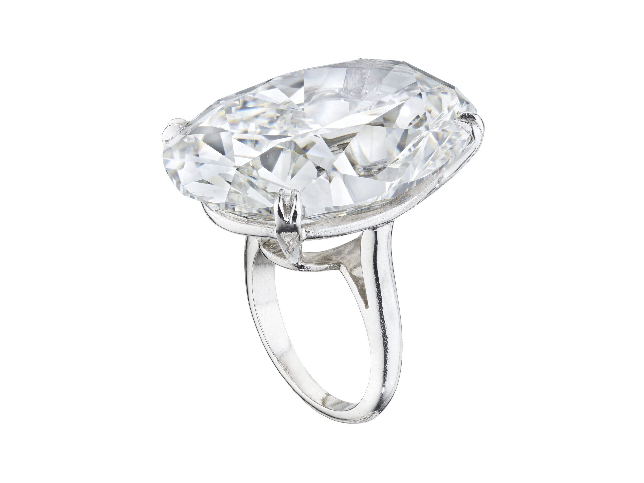 Celebrating the powerful allure of Brilliant White diamonds, this Legacy ring showcases approximately 20 carats of oval diamonds in a luminous high jewelry silhouette.