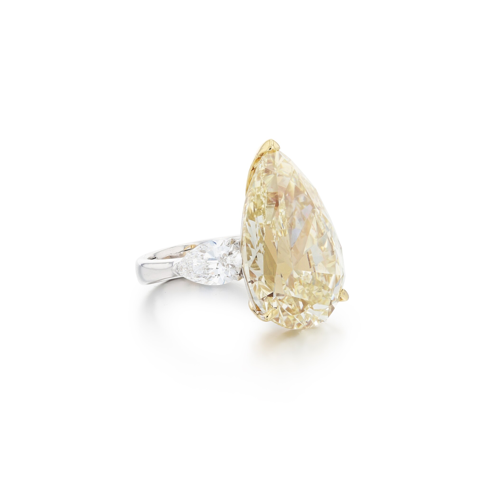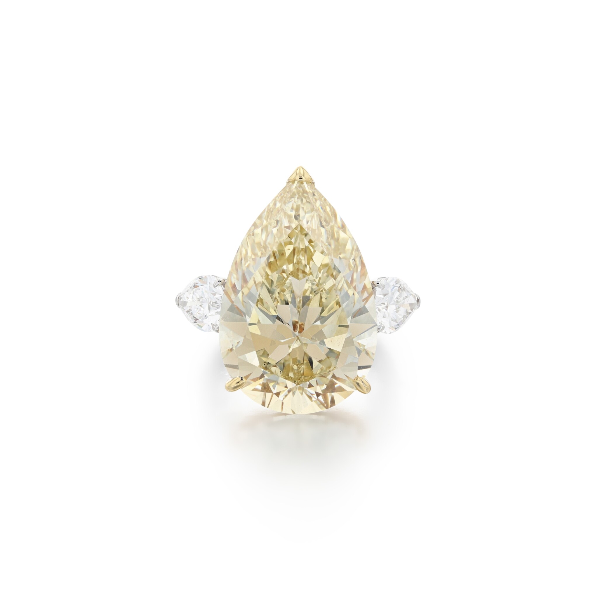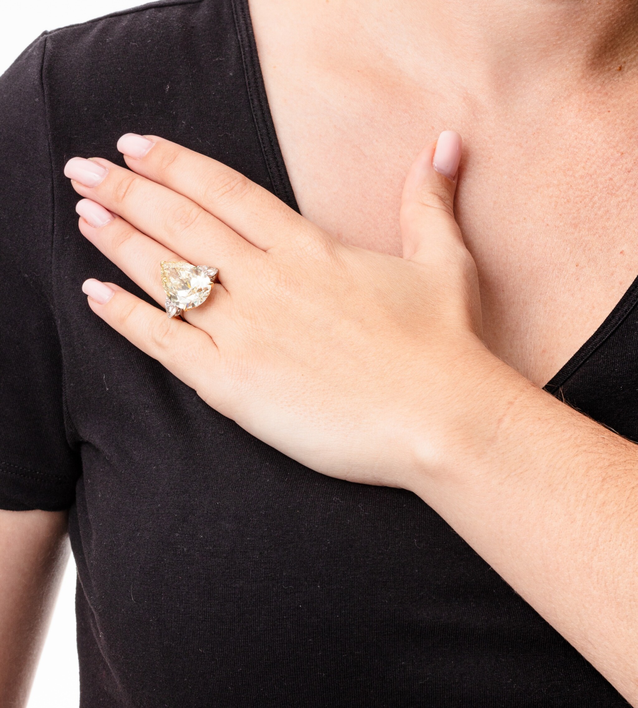 Many of our clients first meet this design as a Heirloom-level luxury gift: a ring that carries 20 carats of diamonds but, more importantly, carries the weight of everything that has been shared and built together. The measured Fancy Yellow glow and the composed Pear silhouette make it feel intimate rather than ostentatious.