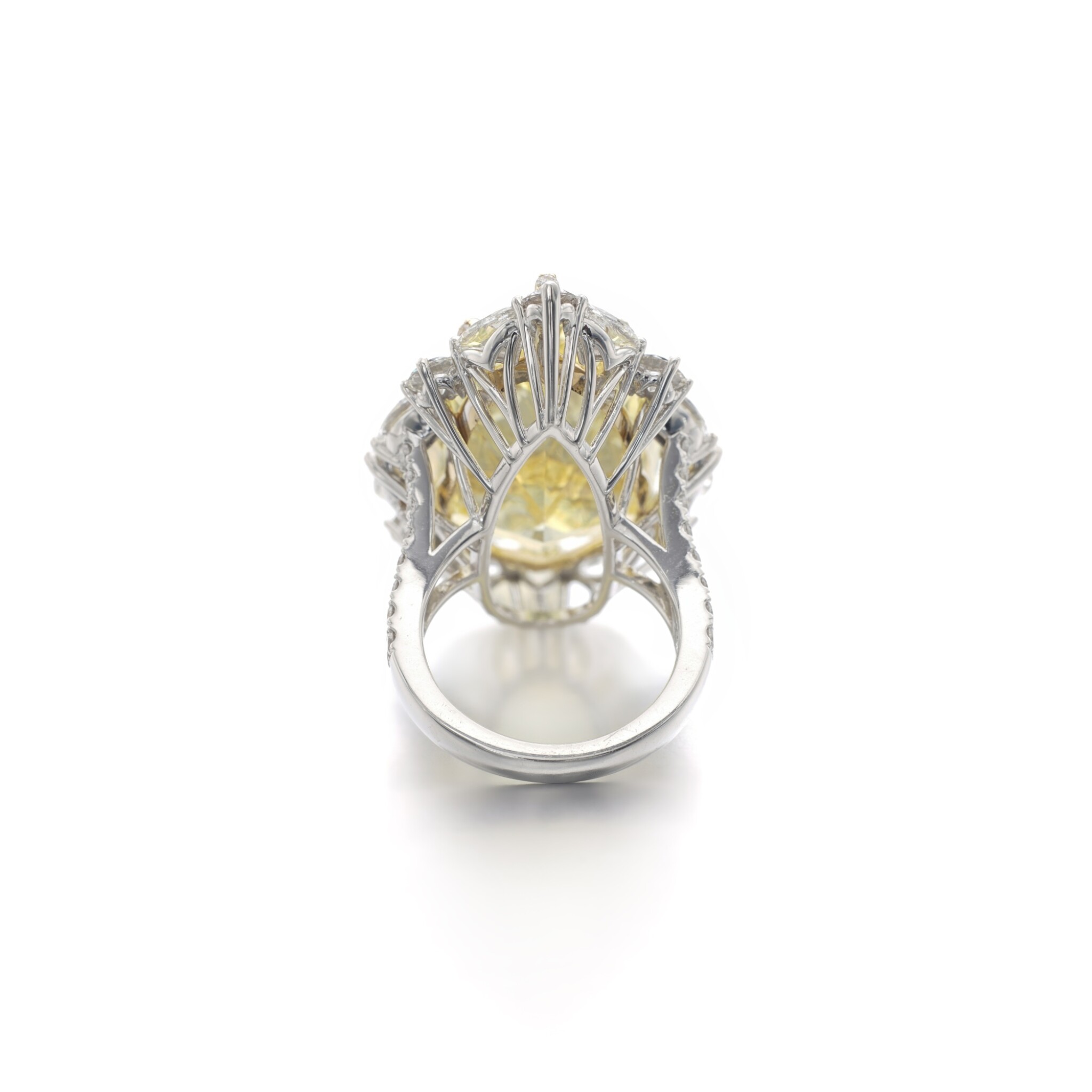 Inspired by the great high jewelry rings seen on red carpets and at state dinners, this Legacy creation showcases approximately 20 carats of Fancy Yellow diamonds in a deliberately timeless profile.