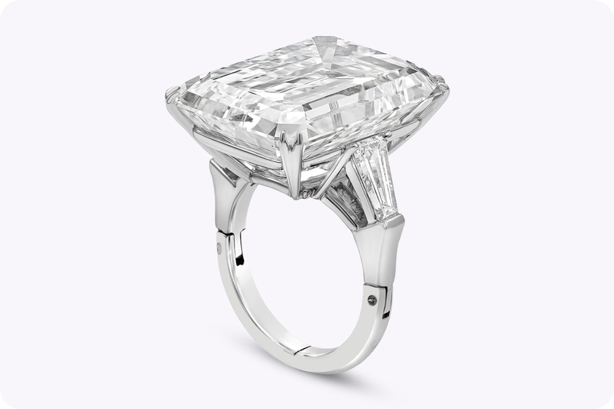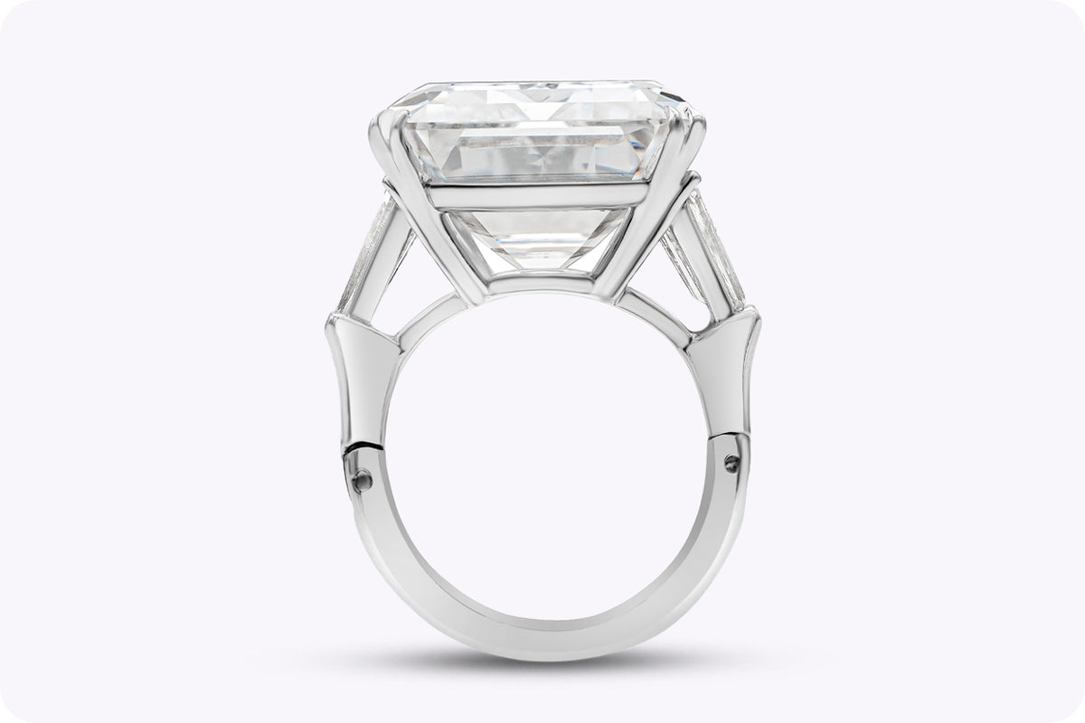 Inspired by the great high jewelry rings seen on red carpets and at state dinners, this Legacy creation showcases approximately 25.32 carats of Emerald Green Emerald cut diamonds in a deliberately timeless profile.