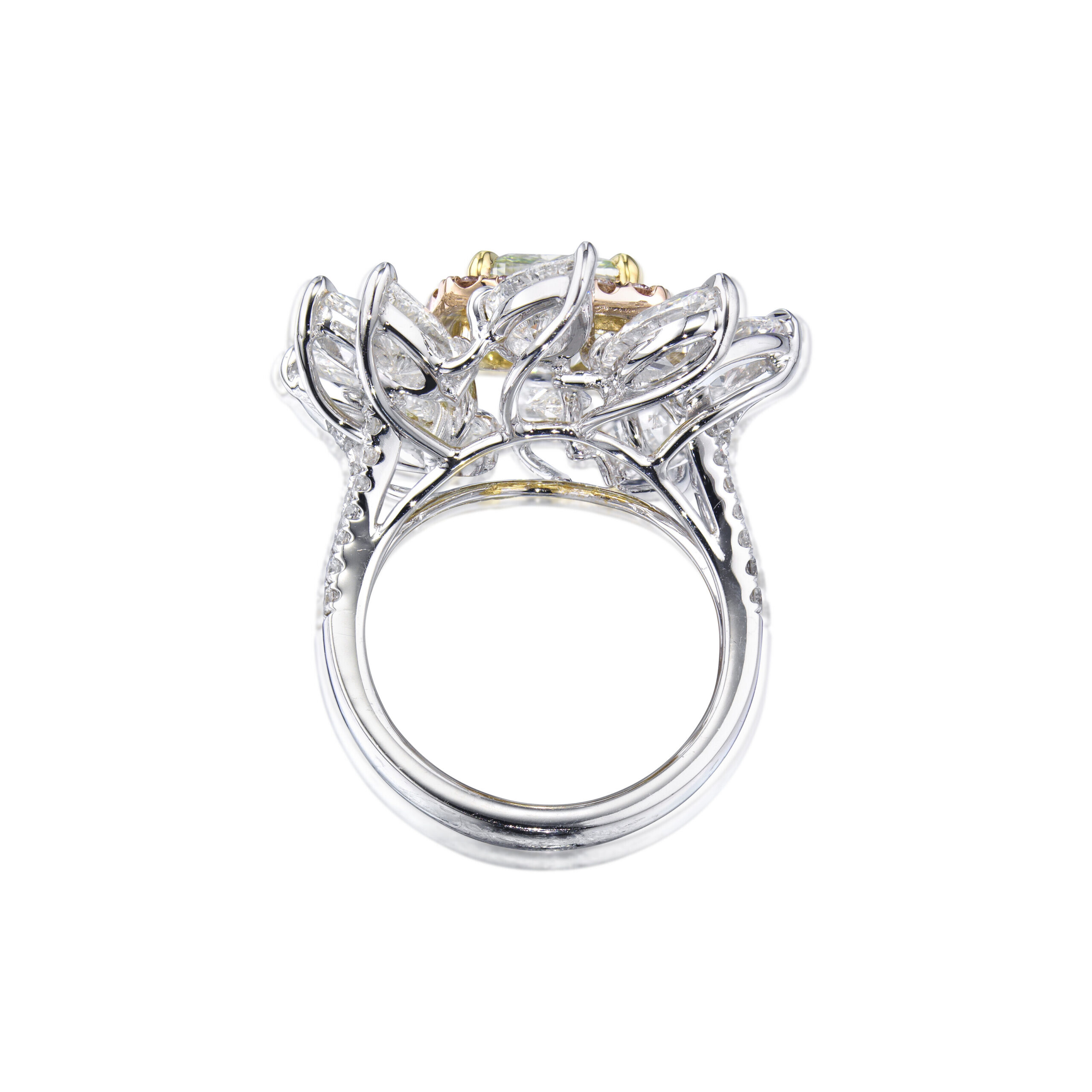 Every fancy colour diamonds in this design has a job to do. The approximately 3.1 carats of Fancy Yellow Cushion cut diamonds are arranged so that larger fancy colour diamonds carry the broad flashes of light, while supporting fancy colour diamonds fill in the gaps with fine scintillation.