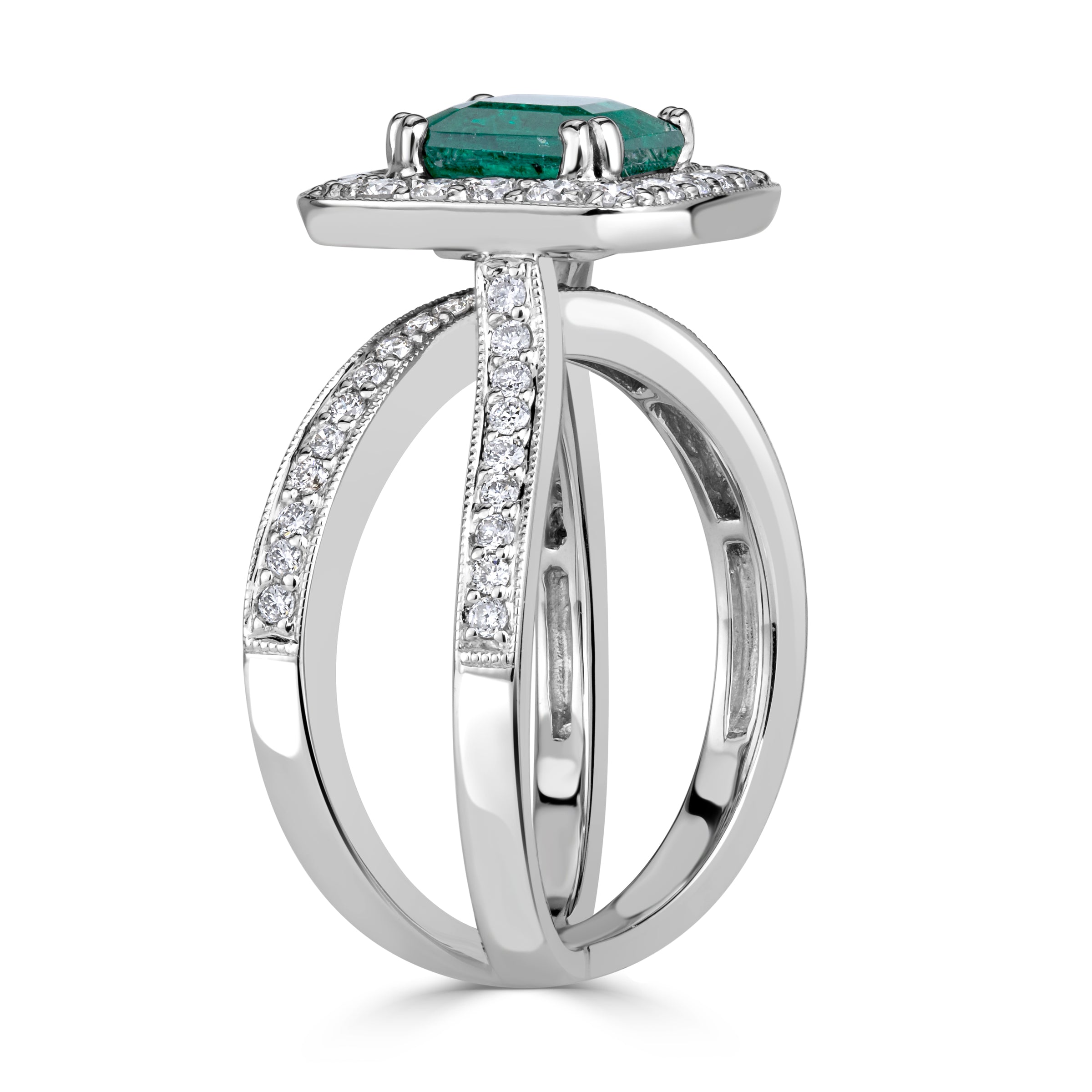 The Emerald Green Emerald cut diamonds are graded and positioned so the eye reads one calm, even surface of brilliance. Subtle transitions in size and angle are used to guide light along the curve of the finger, ensuring the approximately 3.19 carats of diamonds and gemstones fire together instead of in isolated flashes.