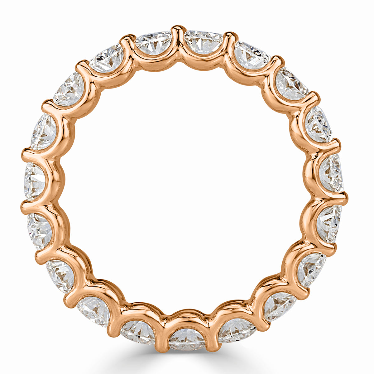 The Brilliant White oval diamonds are graded and positioned so the eye reads one calm, even surface of brilliance. Subtle transitions in size and angle are used to guide light along the curve of the finger, ensuring the approximately 3.7 carats of diamonds fire together instead of in isolated flashes.