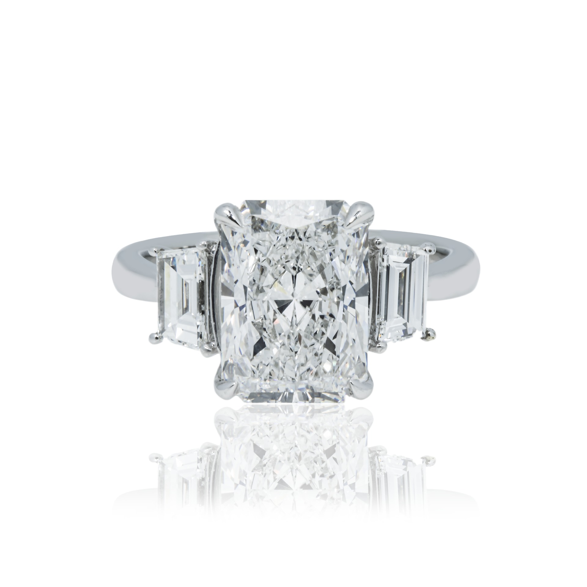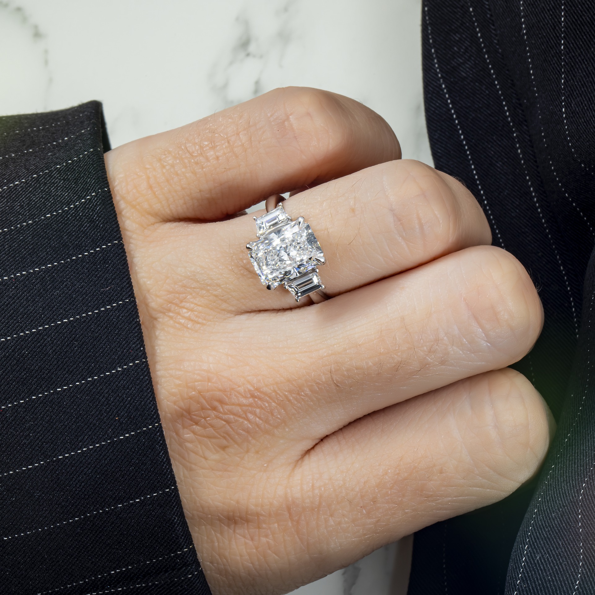 From a styling perspective, the strength of this design lies in its clarity: a disciplined row of Radiant diamonds, a focused 3.72 carats of Brilliant White light and a considered Engagement Ring profile. In everyday use, that means you can keep everything else quiet and still feel fully dressed β a single bracelet, a classic pair of earrings and perhaps one additional ring are more than enough.
