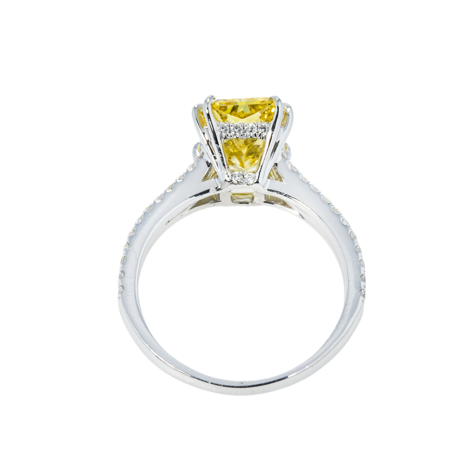 Approximately 3.83 carats, radiant, statement ring, diamond ring. Designed to feel like a personal signature: refined, wearable, and unmistakably high-end. Colour family: Fancy Yellow. Metal: 18K White Gold. Every decision is made for visual integrity: even sparkle, clean outline, and a flattering look across lighting conditions. Its value is in its discipline: the ring looks composed up close and commanding from across a room. Made to be worn often, remembered clearly, and passed forward with pride. Sunlit Royal Radiance—a piece defined by brilliance, poise, and longevity.