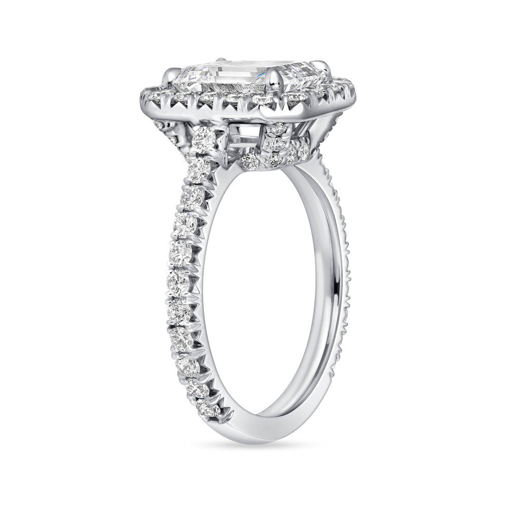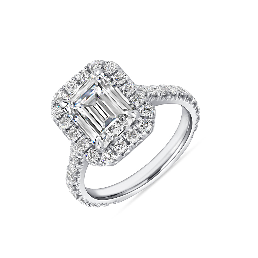 Approximately 3 carats, emerald, halo, diamond ring. Created for those who prefer quiet powerβbrilliance without chaos. Colour family: Emerald Green. The silhouette is disciplined and intentional, designed to keep the piece elegant rather than overstated. The craftsmanship is engineered so the sparkle reads as one surface of lightβnot scattered points competing for attention. Ideal for boardroom-to-black-tie wear, with a look that stays precise under close scrutiny. Effortless Eleganceβa piece defined by brilliance, poise, and longevity.