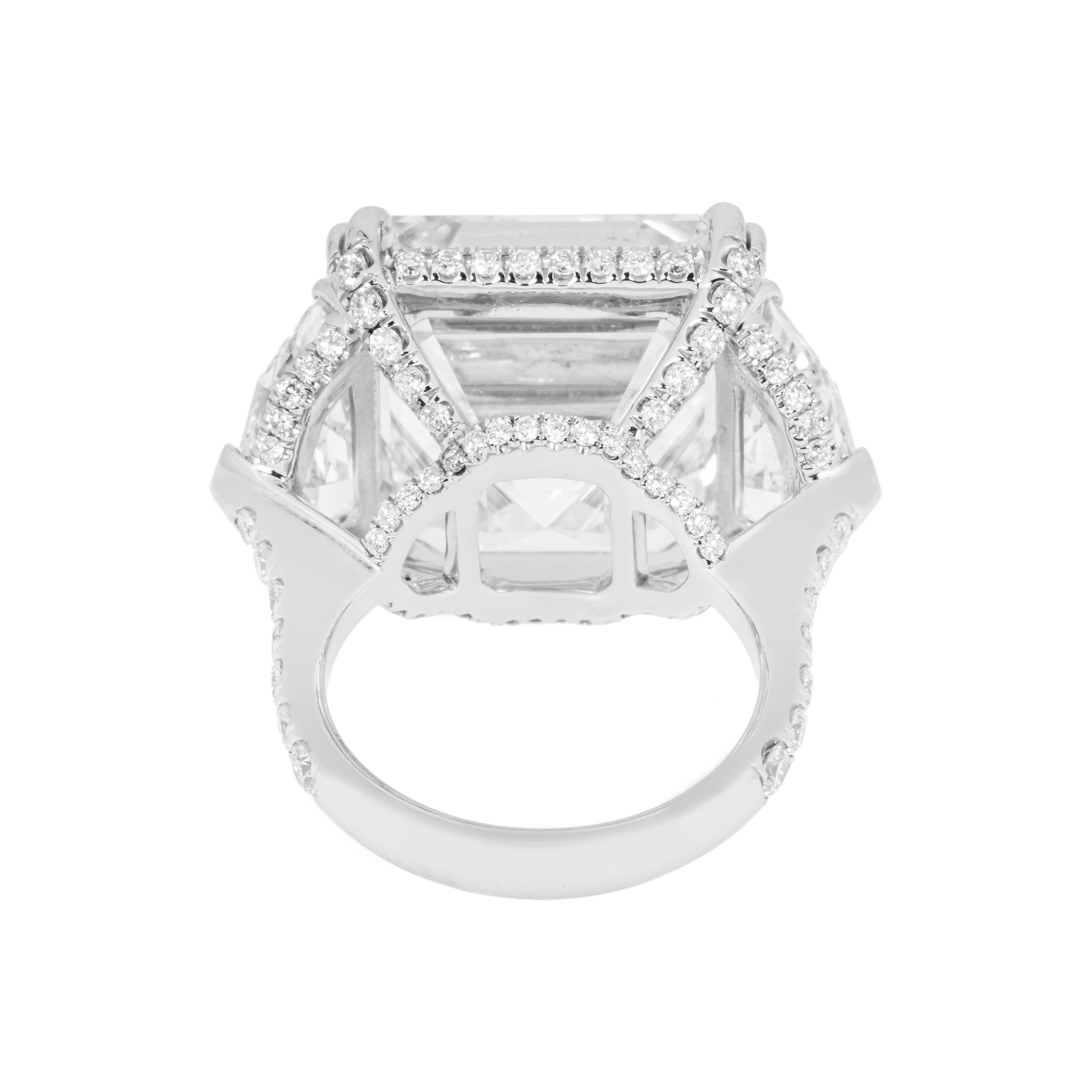 From the first sketch, this design was imagined as a ring that could move seamlessly from gala evenings to private weekends, anchored by approximately 30.48 carats of Brilliant White Asscher diamonds.